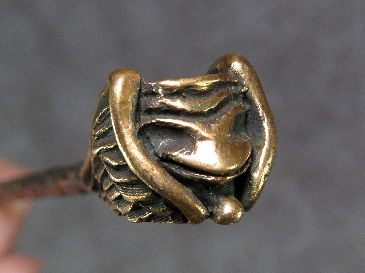 To make this item, a wax model was cut out by hand. Then, using the lost wax method, bronze parts were cast.