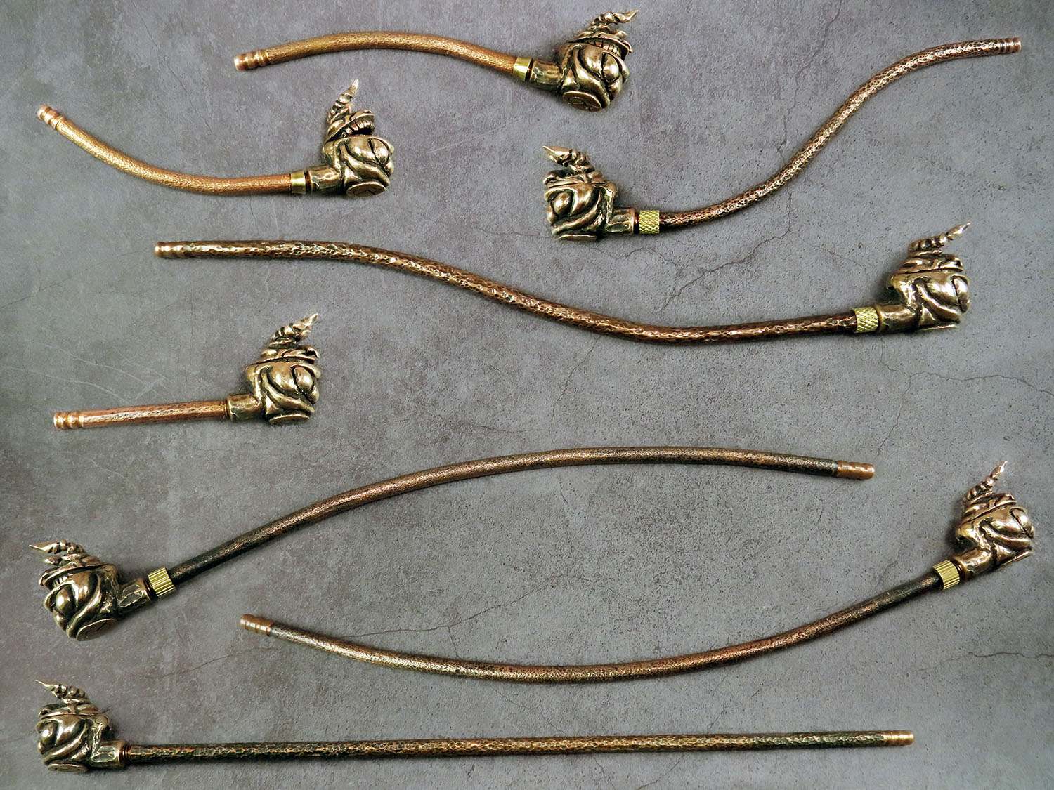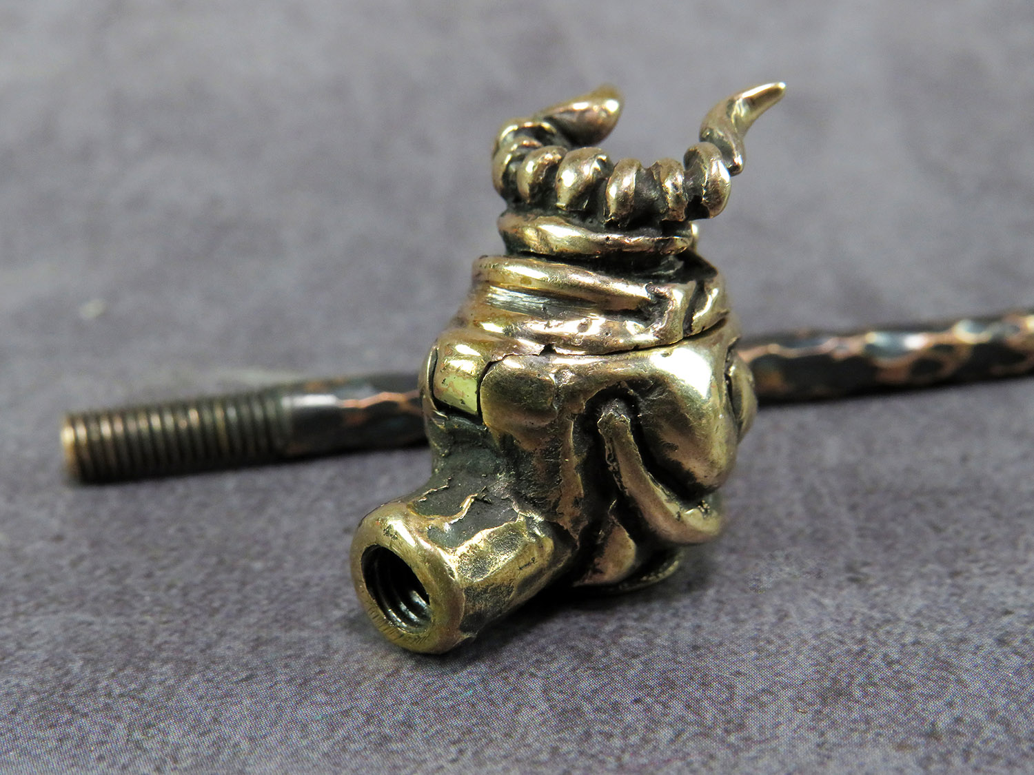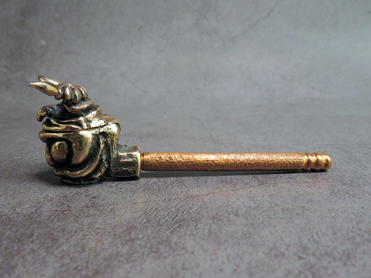 Smoking pipe with a bowl in the form of a head small horned demon. The head has an opening lid and this is not only a smoking accessory, but also a wonderful souvenir. The mouthpiece is made of copper, it is screwed on, can have a length (from 3 to 30 cm) and a shape at the request of the buyer. The pipe is working, not decorative, the model is tested by the master.