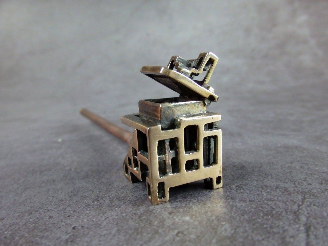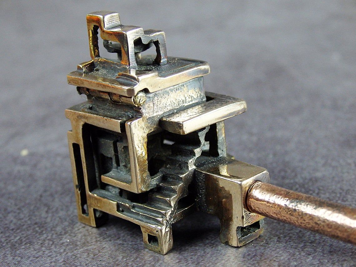 To make this item, a wax model was cut out by hand. Then, using the lost wax method, bronze parts were cast.