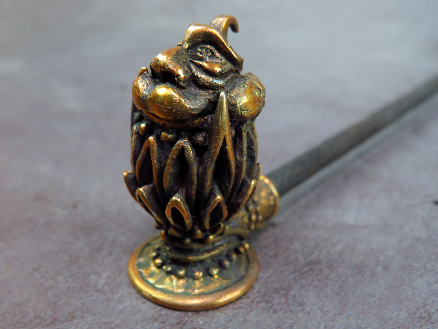 To make this item, a wax model was cut out by hand. Then, using the lost wax method, bronze parts were cast.