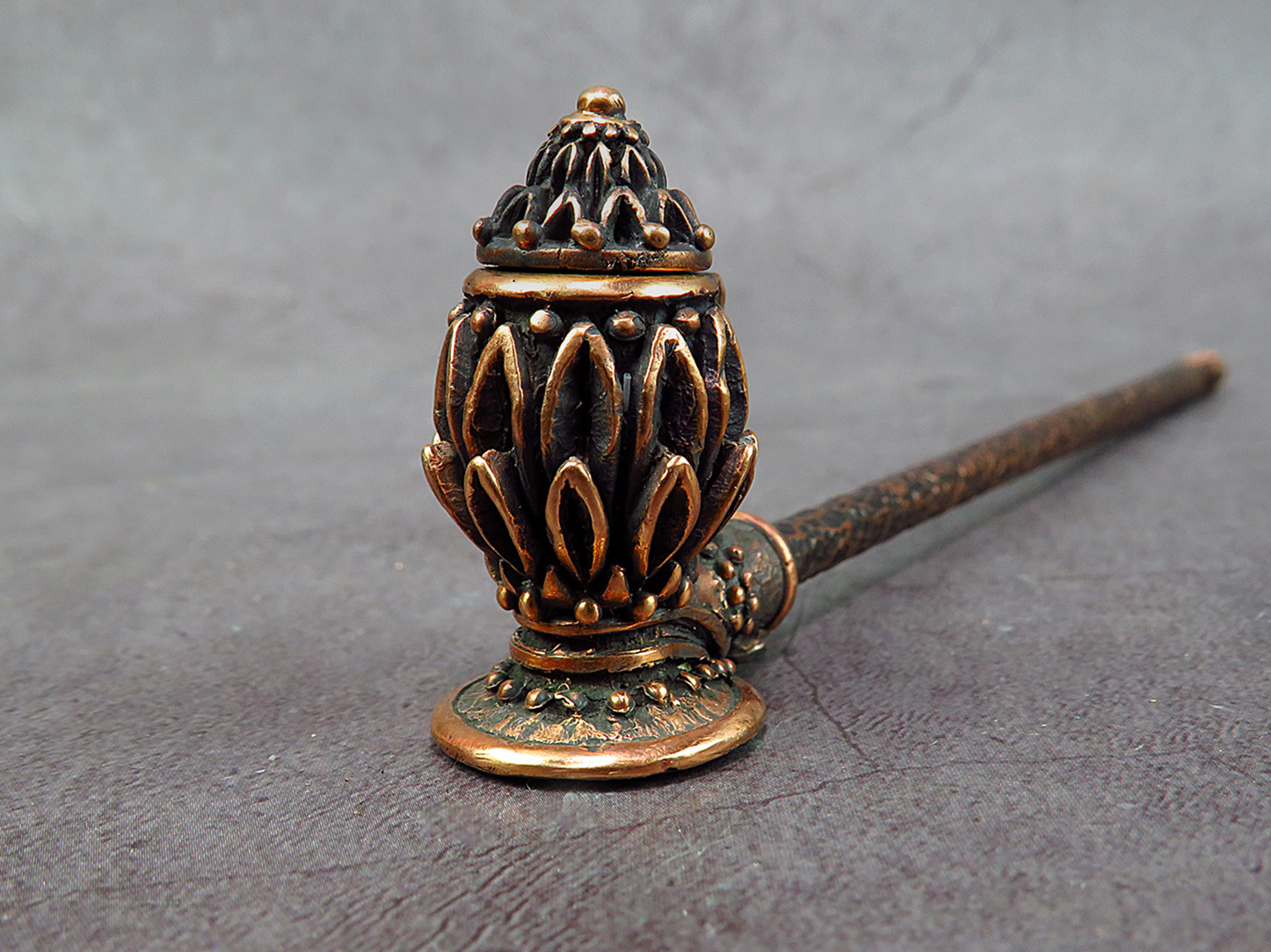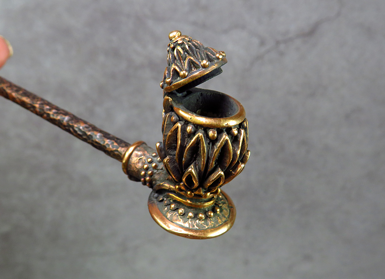 To make this item, a wax model was cut out by hand. Then, using the lost wax method, bronze parts were cast.