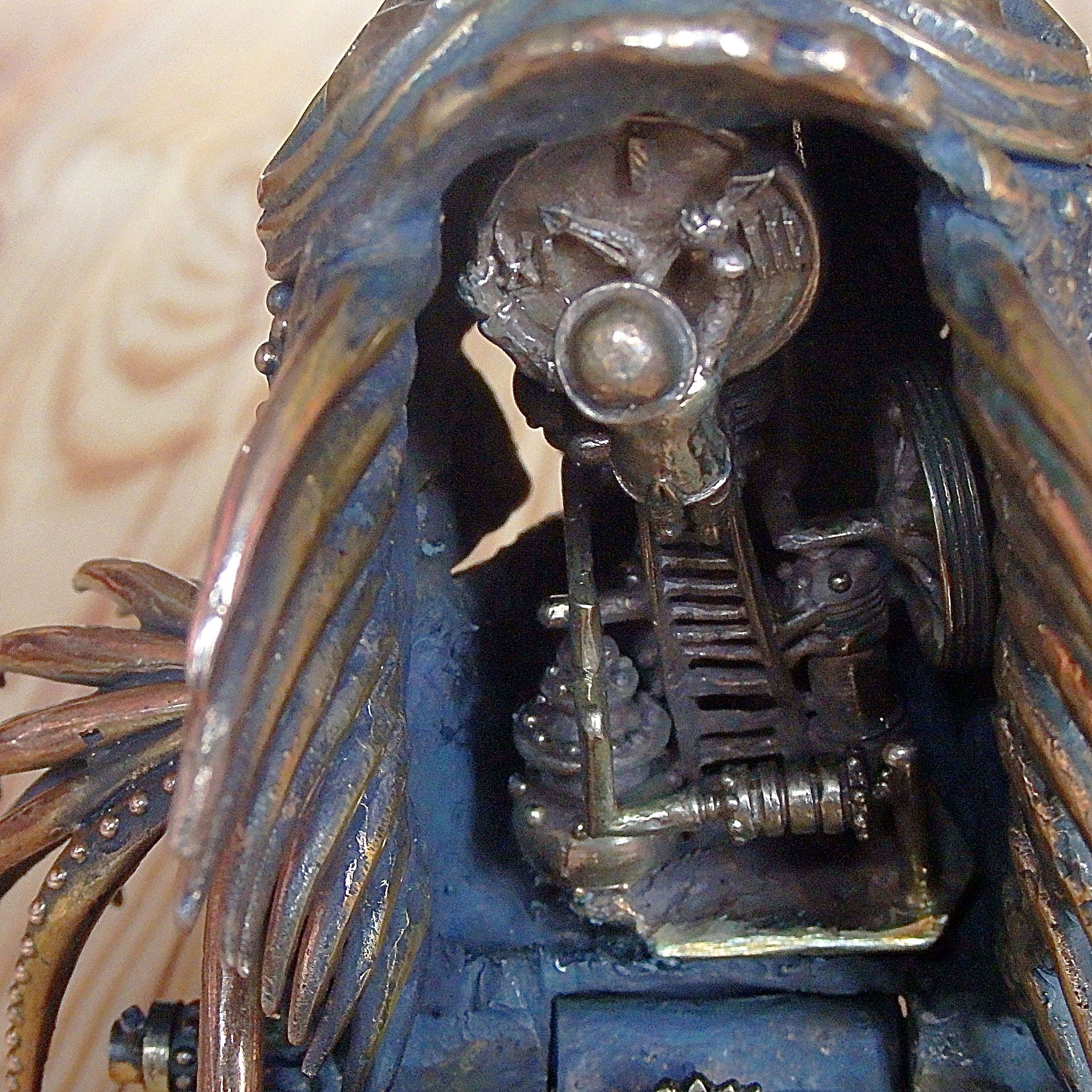 Steampunk interior sculpture, mechanical fish with team inside