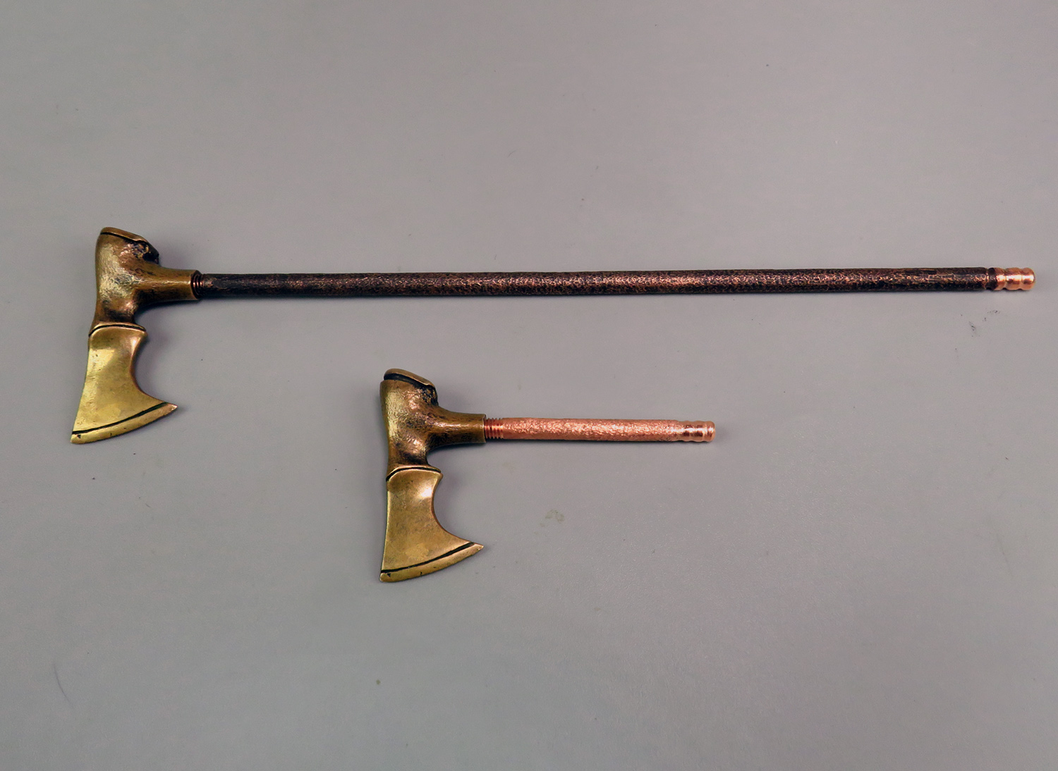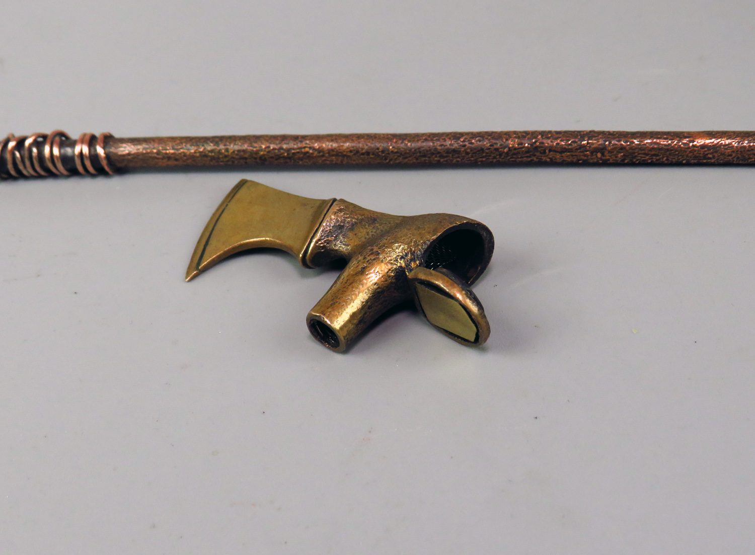 Small bronze pipe in the form of a medieval ax. The stand is made of wood (birch burl). The mouthpiece is made of copper (with copper wire), it is screwed on, can have a length (from 7 to 20 cm) at the request of the buyer. A straight mouthpiece is best suited to this pipe. If you need a different mouthpiece, please indicate this when ordering.