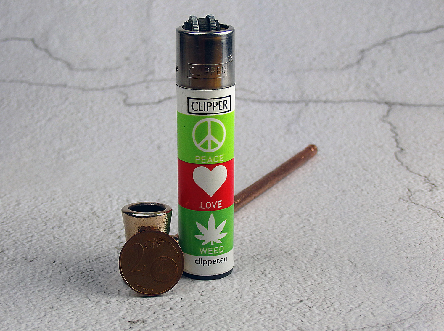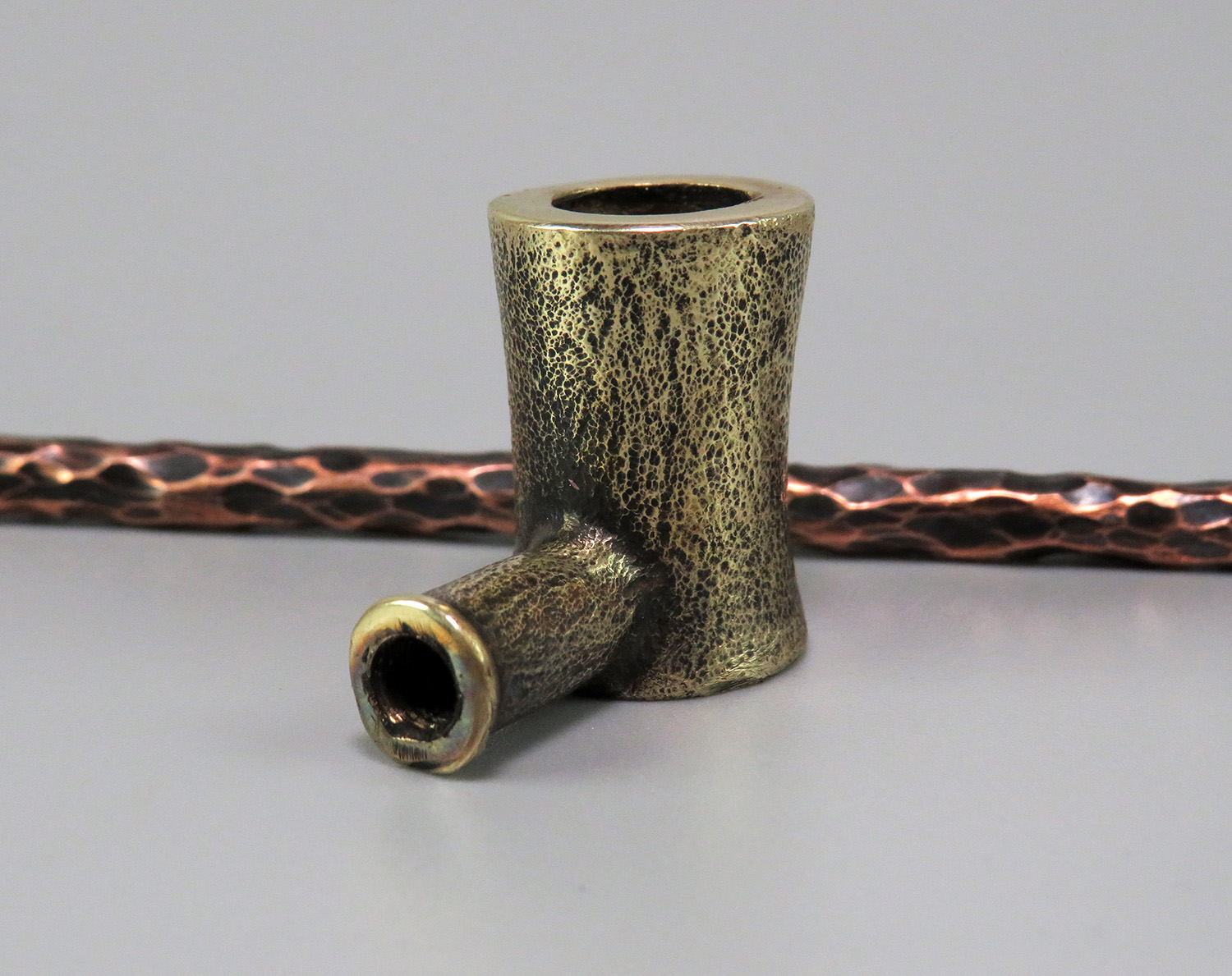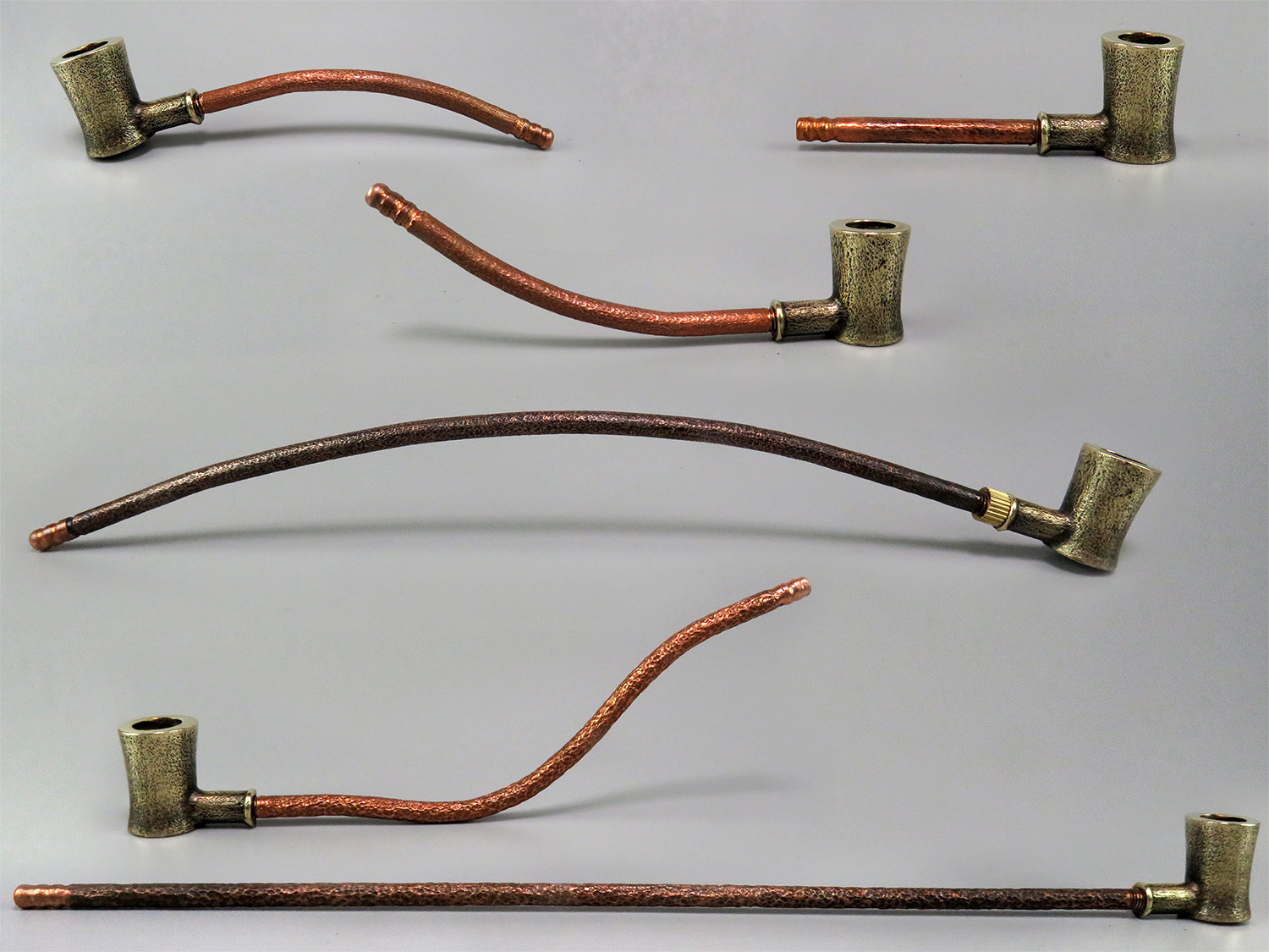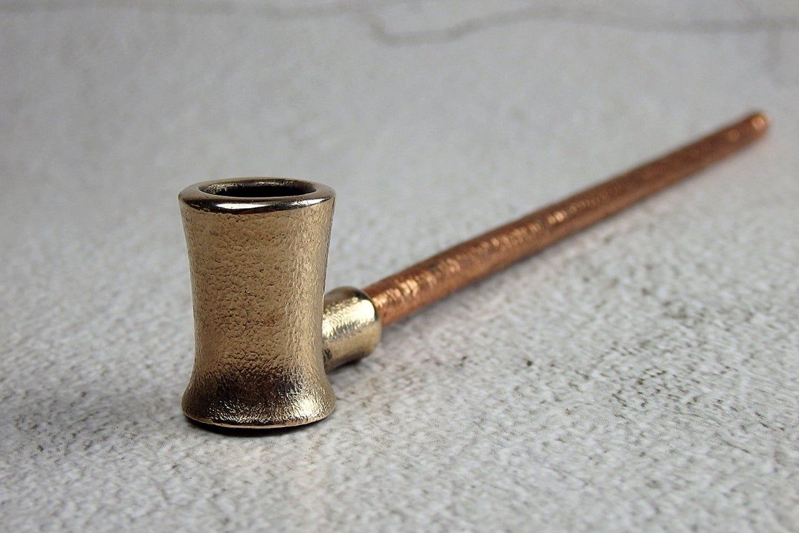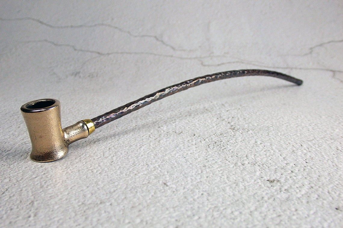 Little bronze smoking pipe with a flat bottom. The mouthpiece is made of copper, it is screwed on, can have a length (from 3 to 30 cm) and a shape at the request of the buyer. The pipe is working, not decorative, the model is tested by the master.