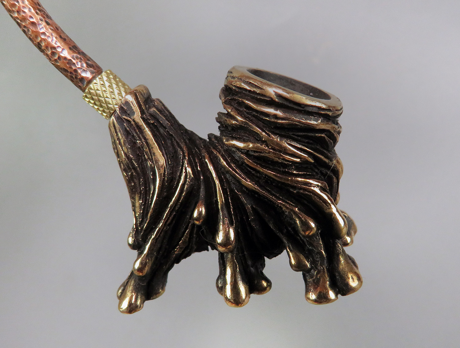 A bronze pipe in the shape of a Mischief Stump—a wild, fairytale puppy an Ents might have.
