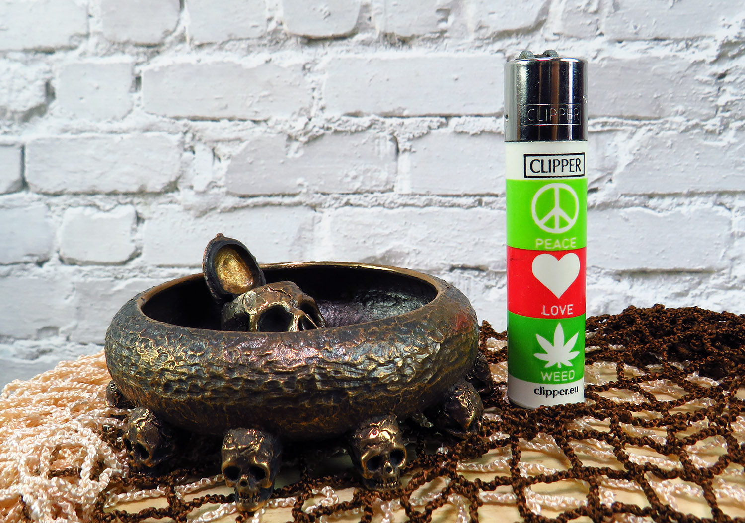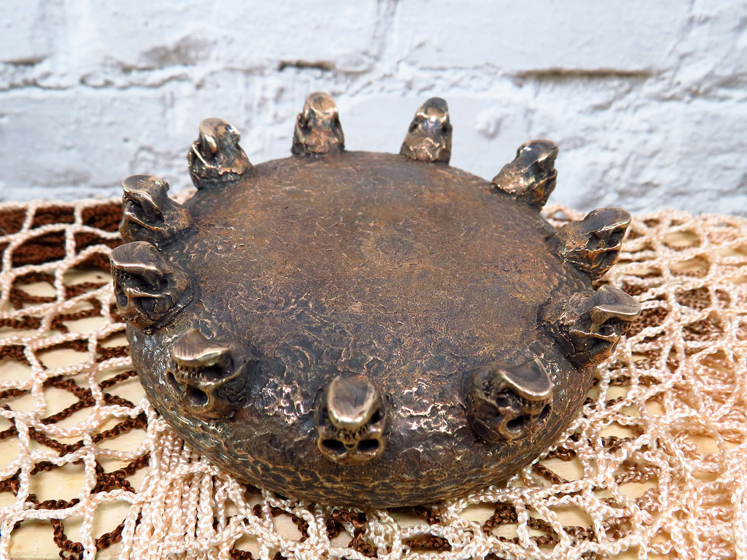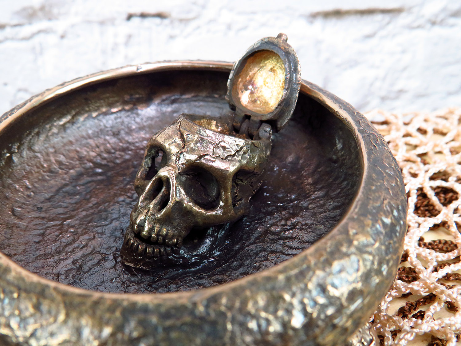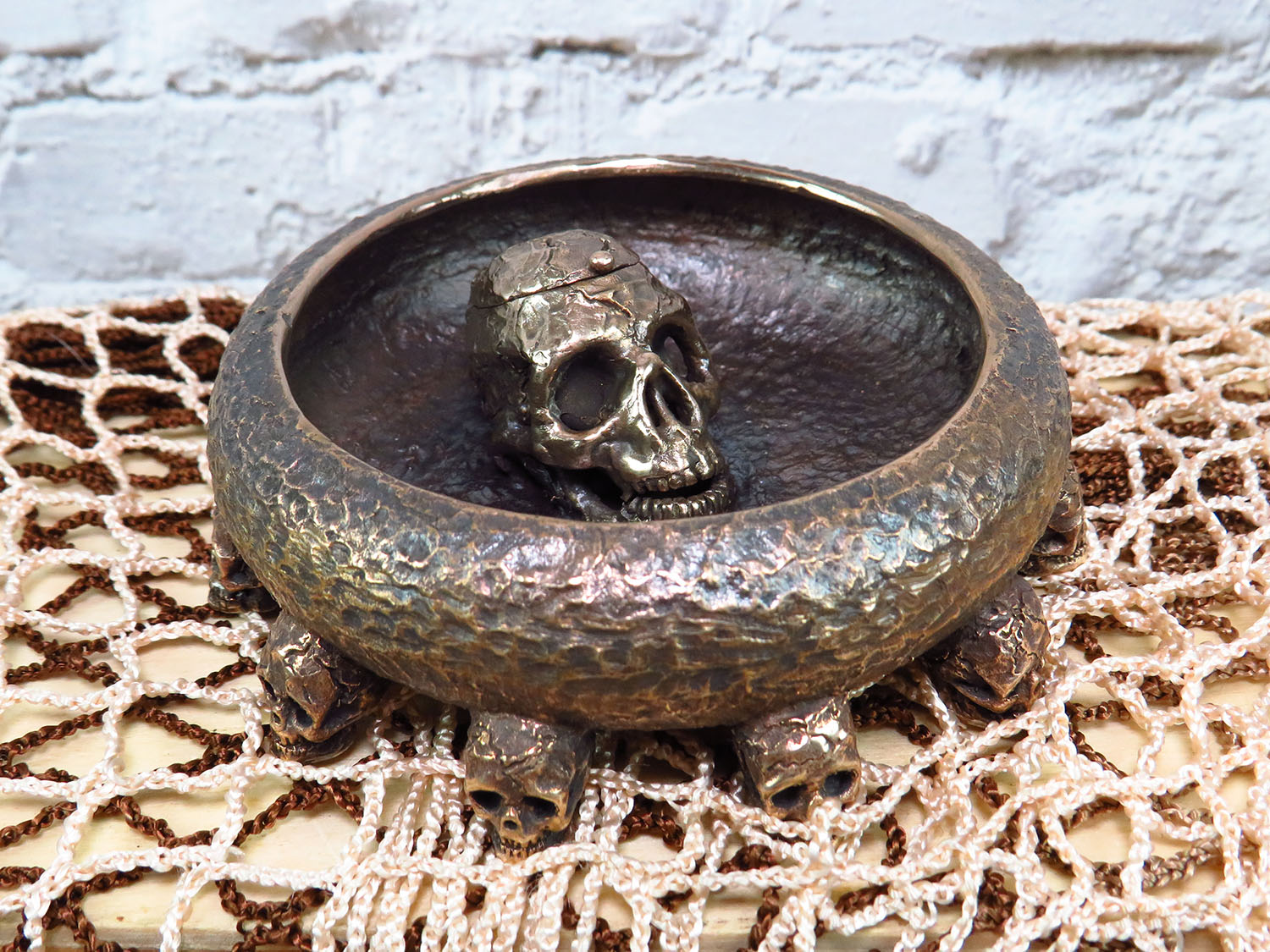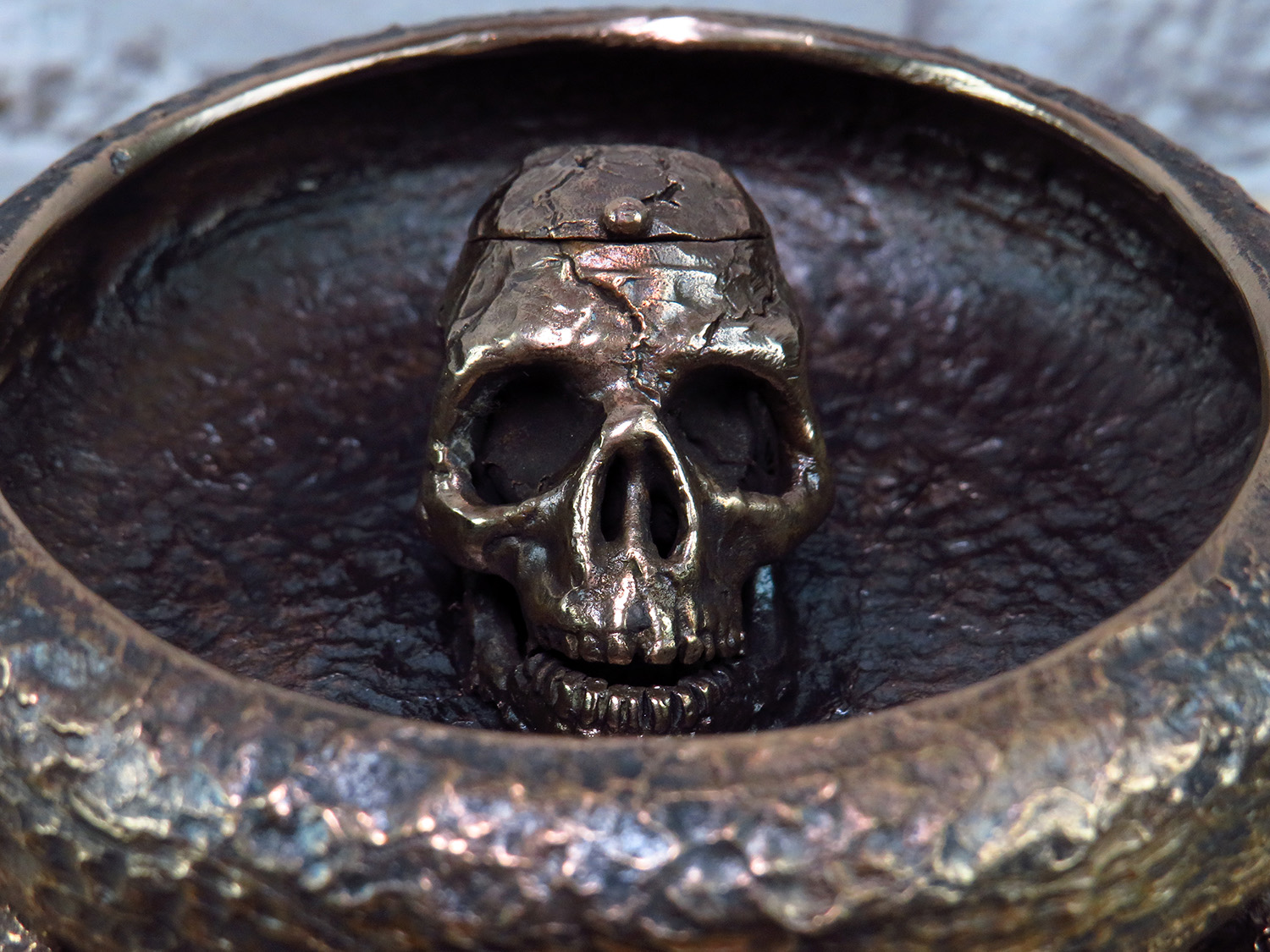 An original bronze ashtray in the Halloween spirit with an opening skull in the middle. It will be a great decoration for the office and a good gift for connoisseurs of creepy and strange things.