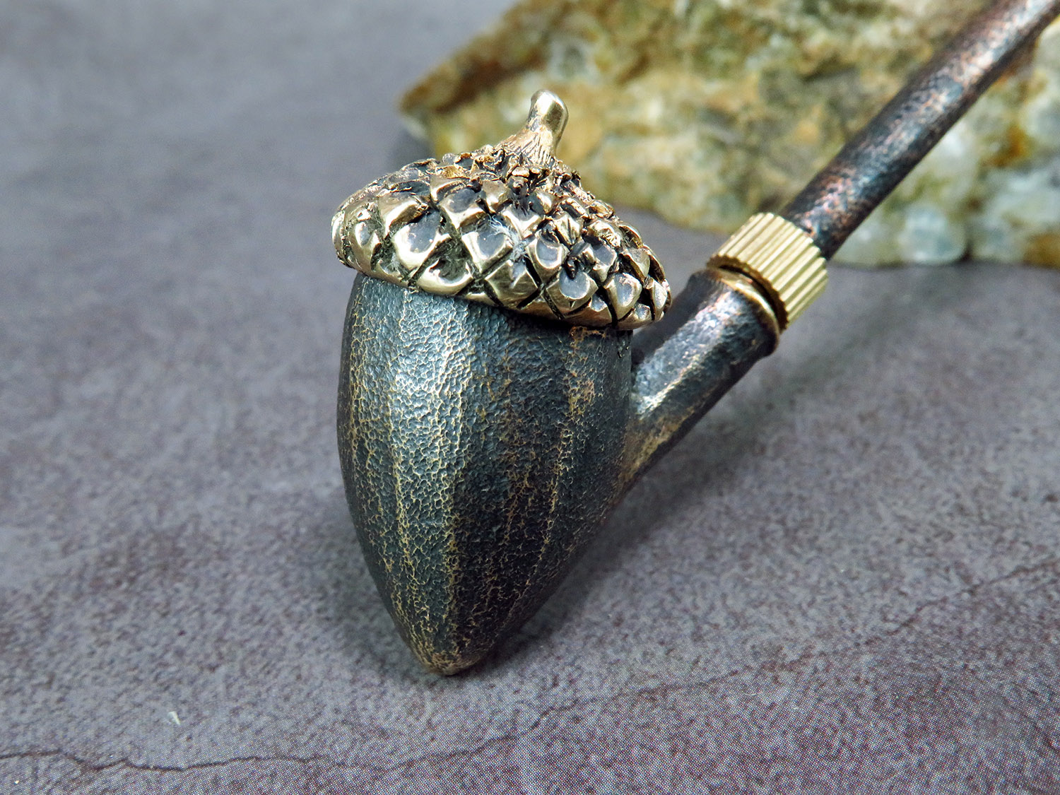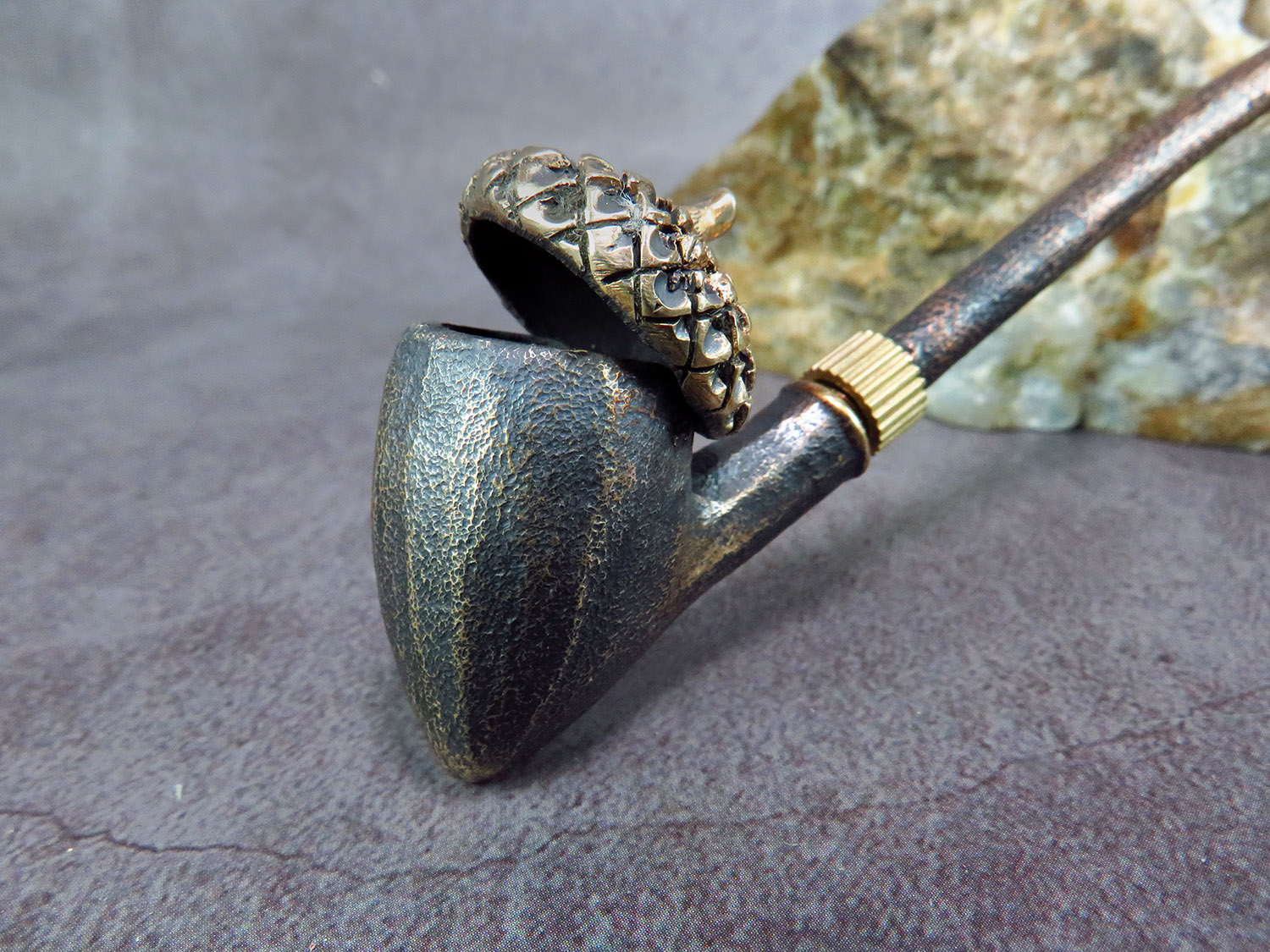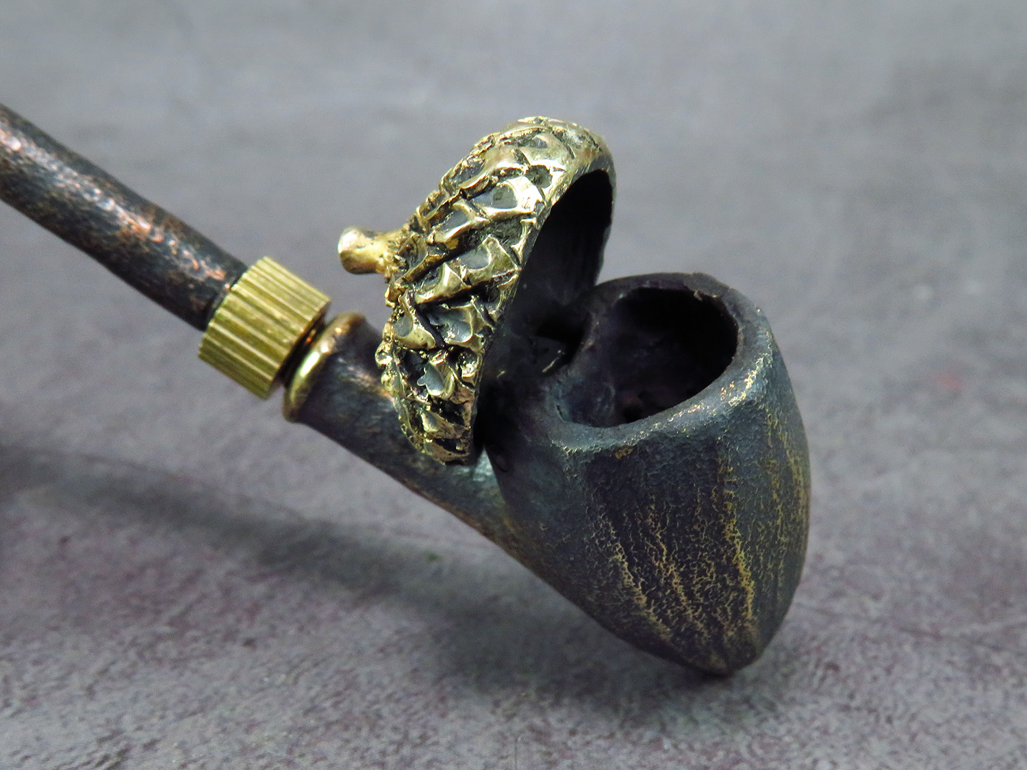 Freehand churchwarden bronze pipe with a bowl in the form of an oak acorn. The mouthpiece is made of copper, it is screwed on, can have a length (from 5 to 30 cm) and a shape at the request of the buyer. The pipe is working, not decorative, the model is tested by the master.