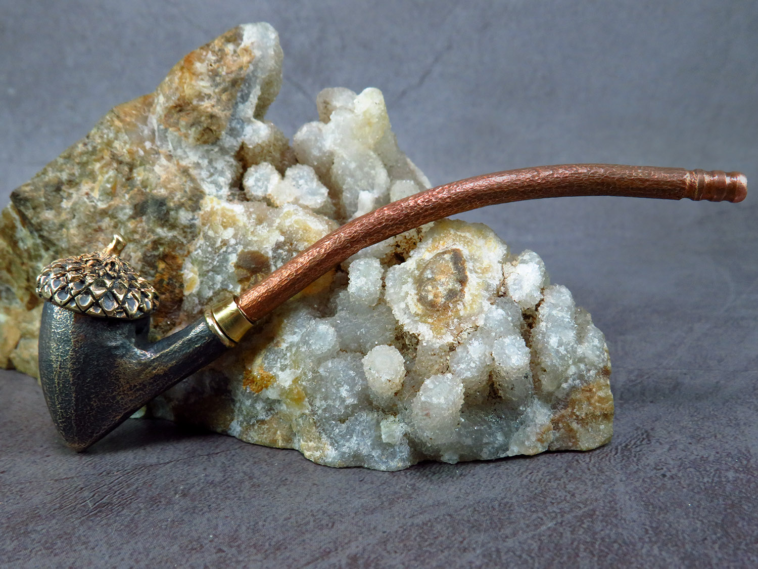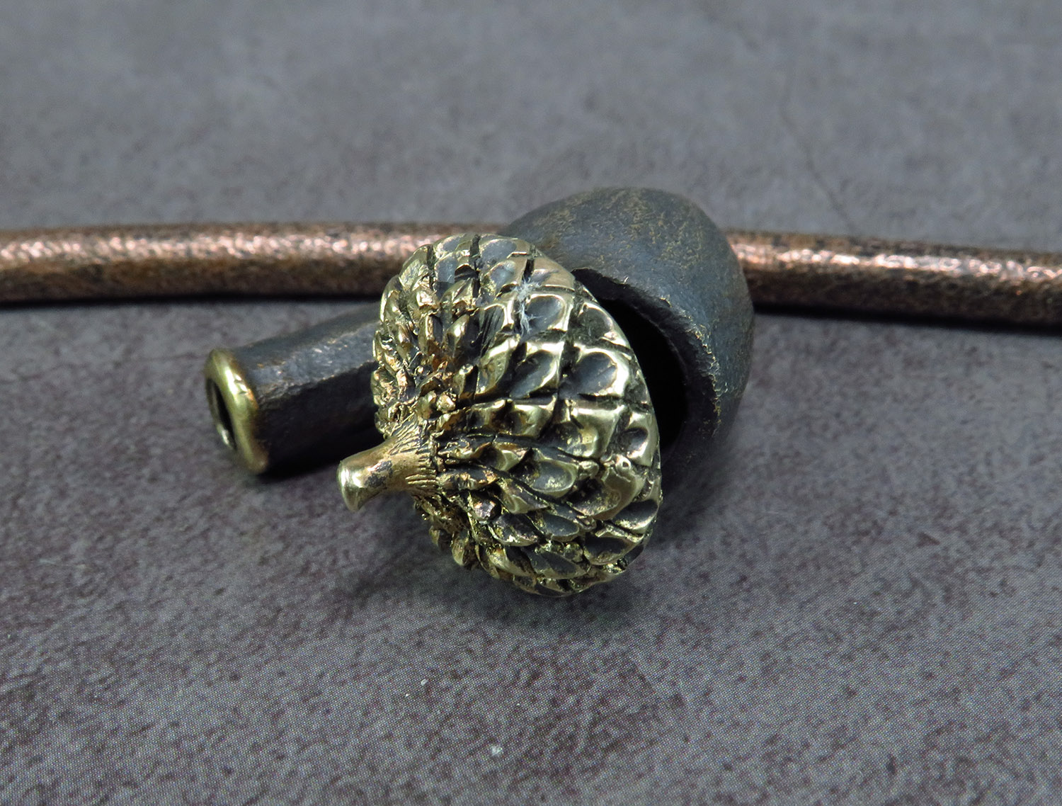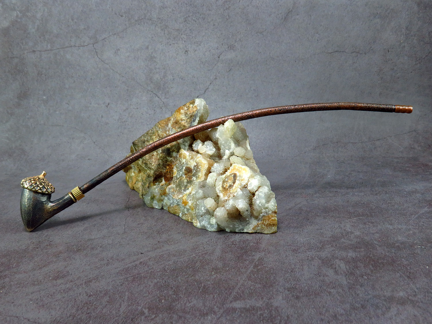 Freehand churchwarden bronze pipe with a bowl in the form of an oak acorn. The mouthpiece is made of copper, it is screwed on, can have a length (from 5 to 30 cm) and a shape at the request of the buyer. The pipe is working, not decorative, the model is tested by the master.