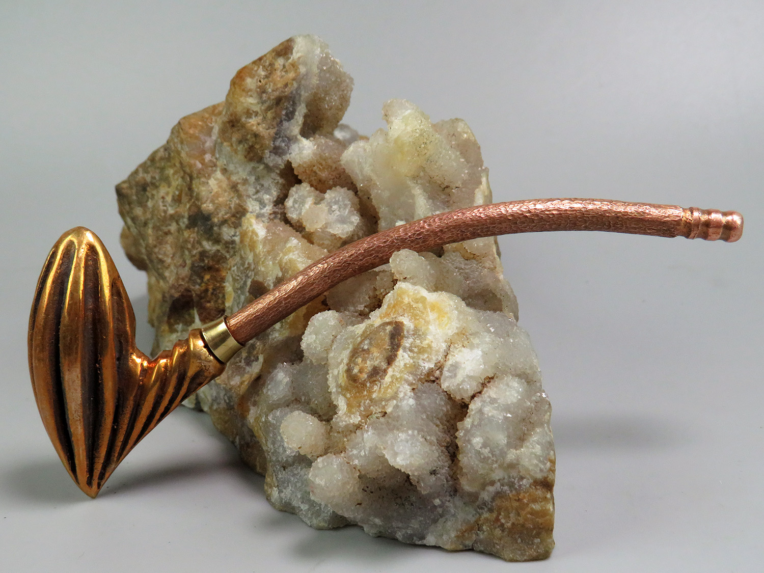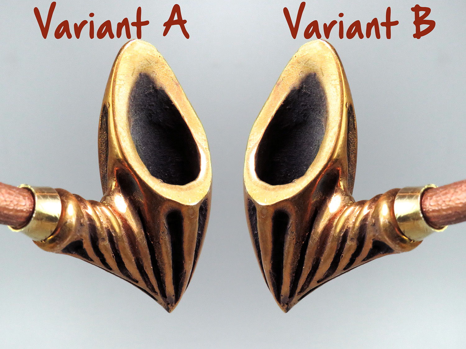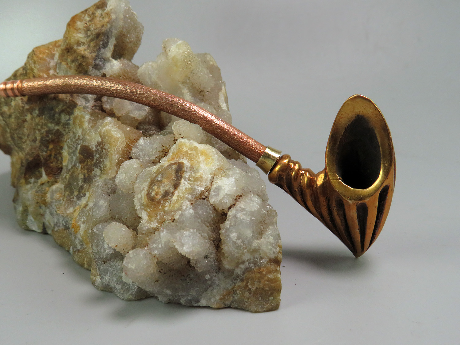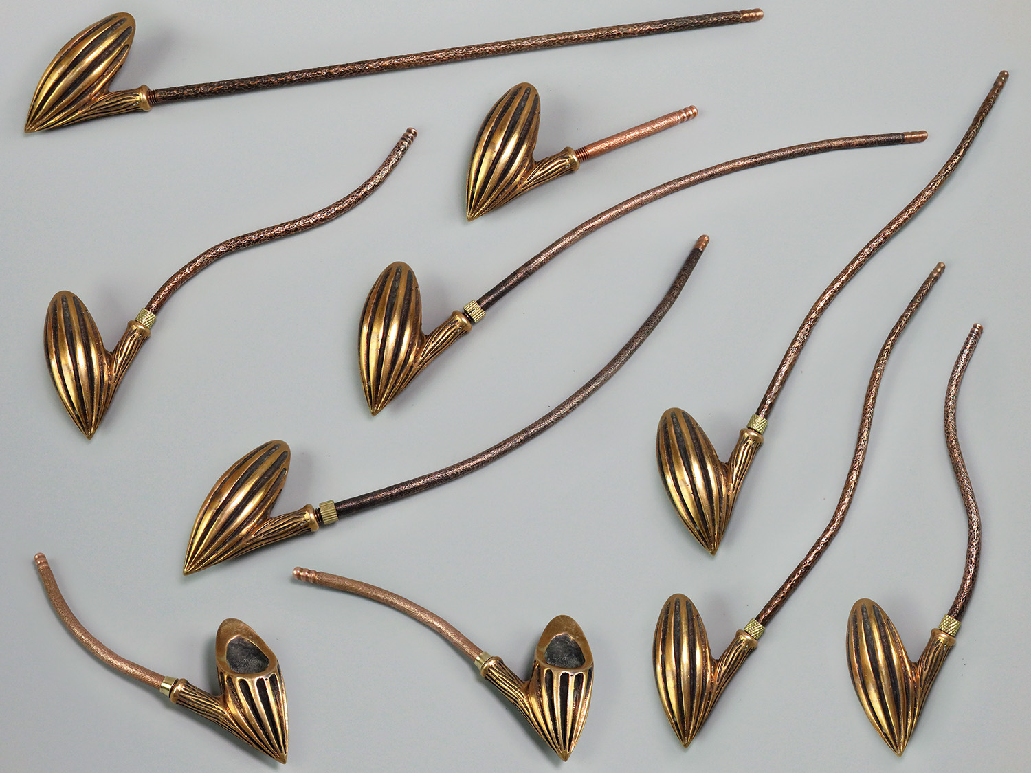 The mouthpiece is made of copper, it is screwed on, can have a length (from 5 to 30 cm) and a shape at the request of the buyer. The pipe is working, not decorative, the model is tested by the master.