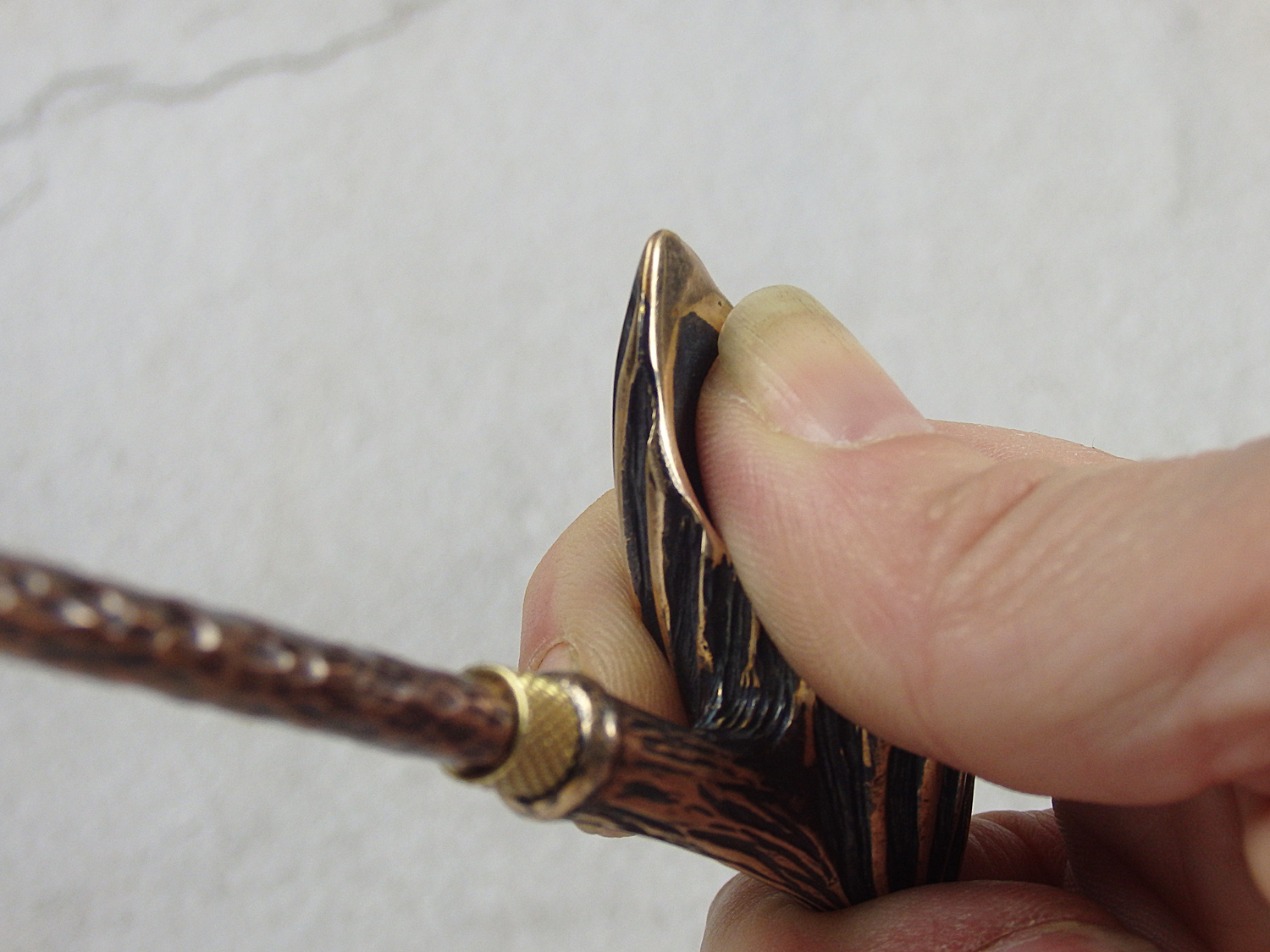 To make this item, a wax model was cut out by hand. Then, using the lost wax method, bronze parts were cast.