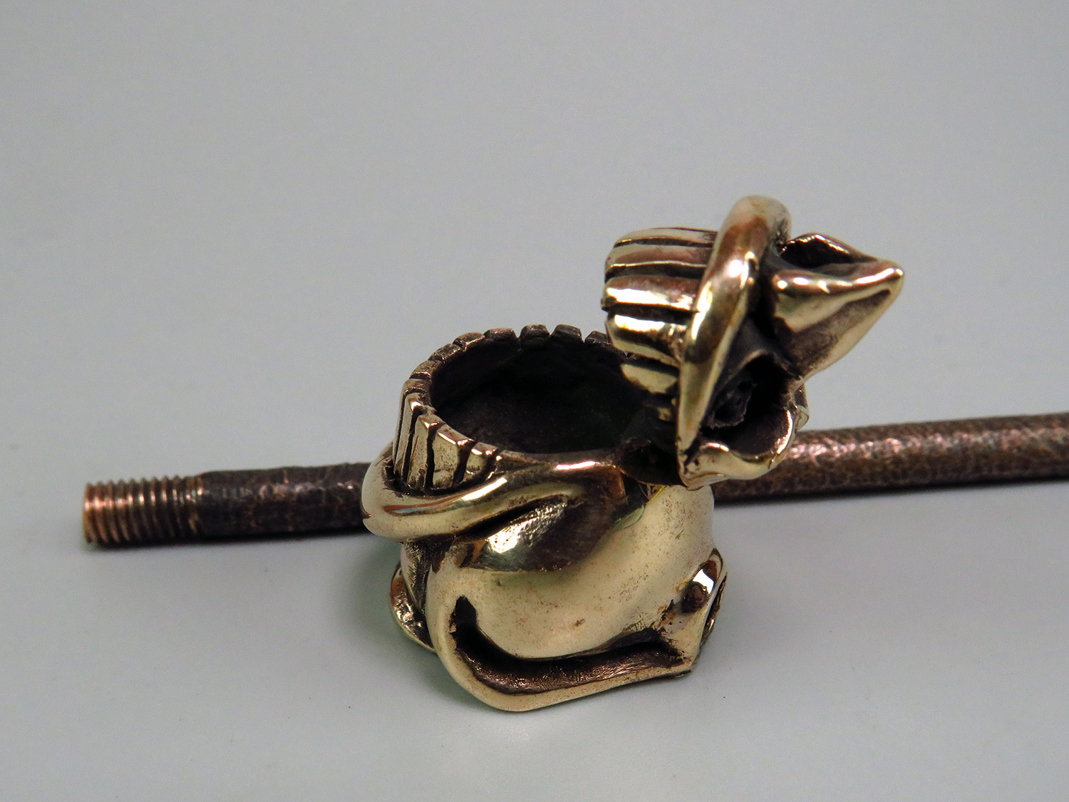 To make this item, a wax model was cut out by hand. Then, using the lost wax method, bronze parts were cast.