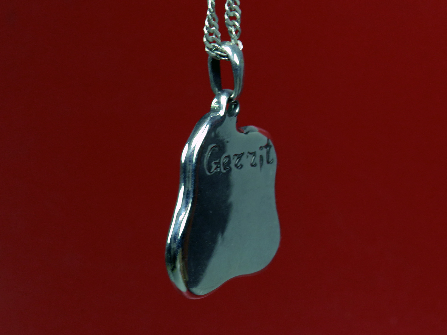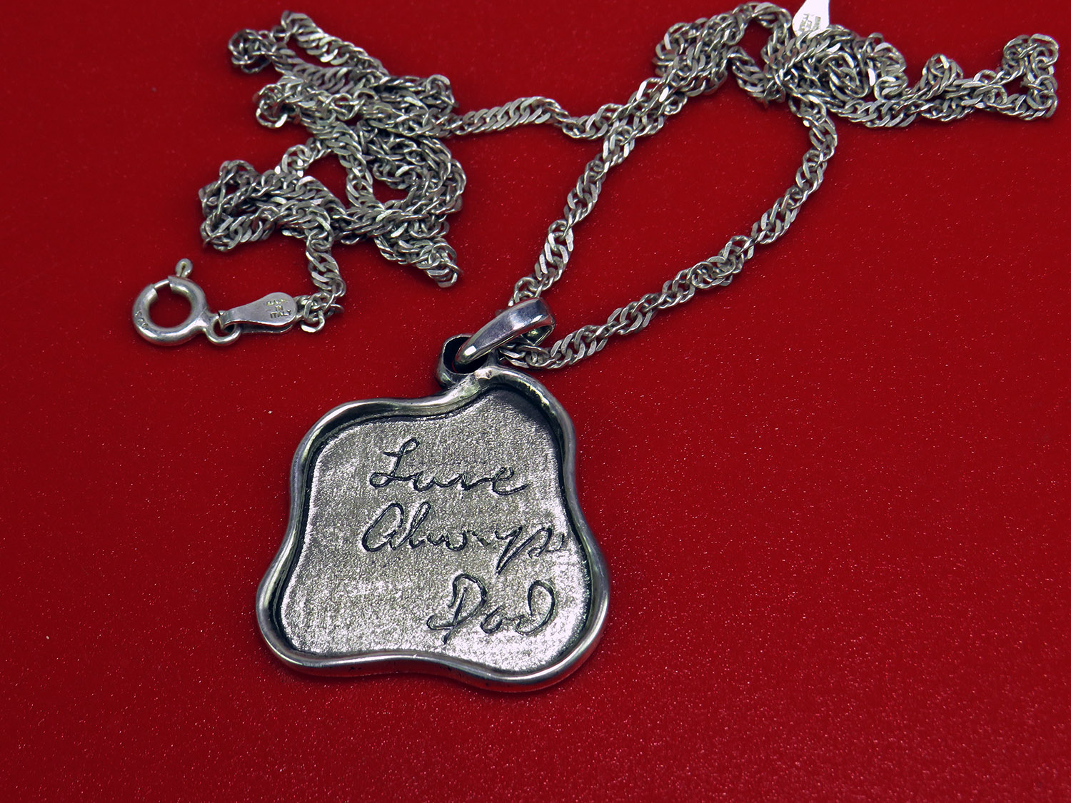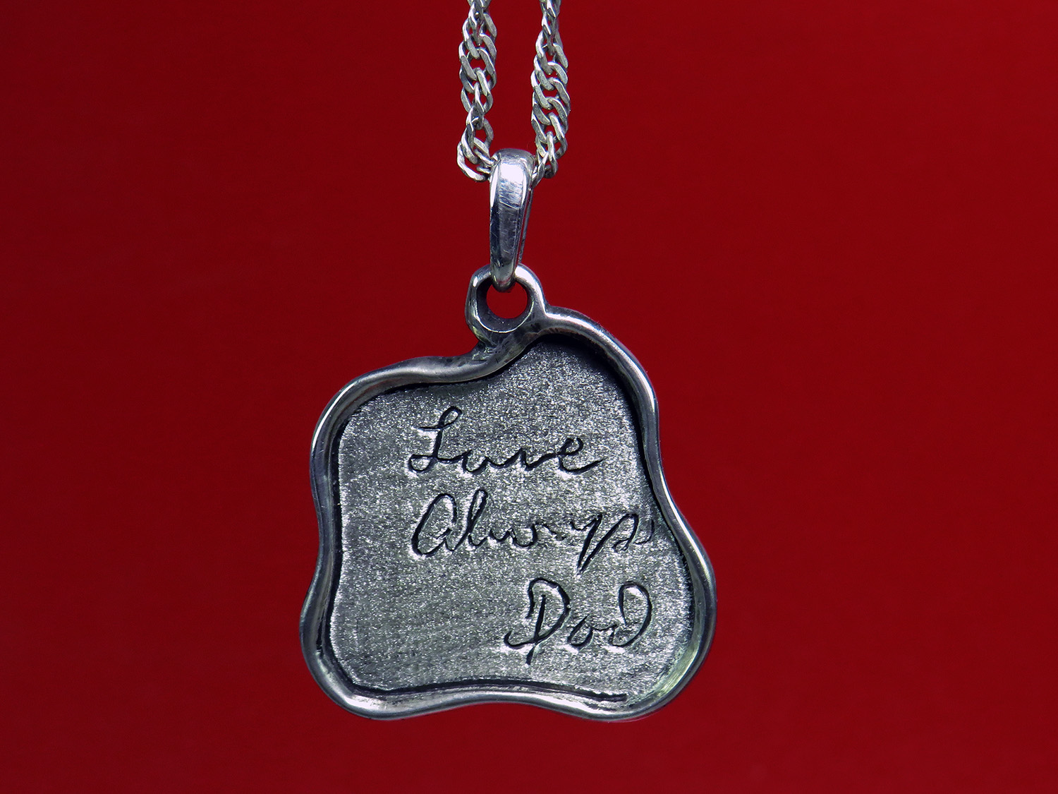 Unique irregular silver pendant with your text, a memorable date, or a dedication to a loved one. The pendant is double-sided, so an inscription (or signature) can be made on both sides.