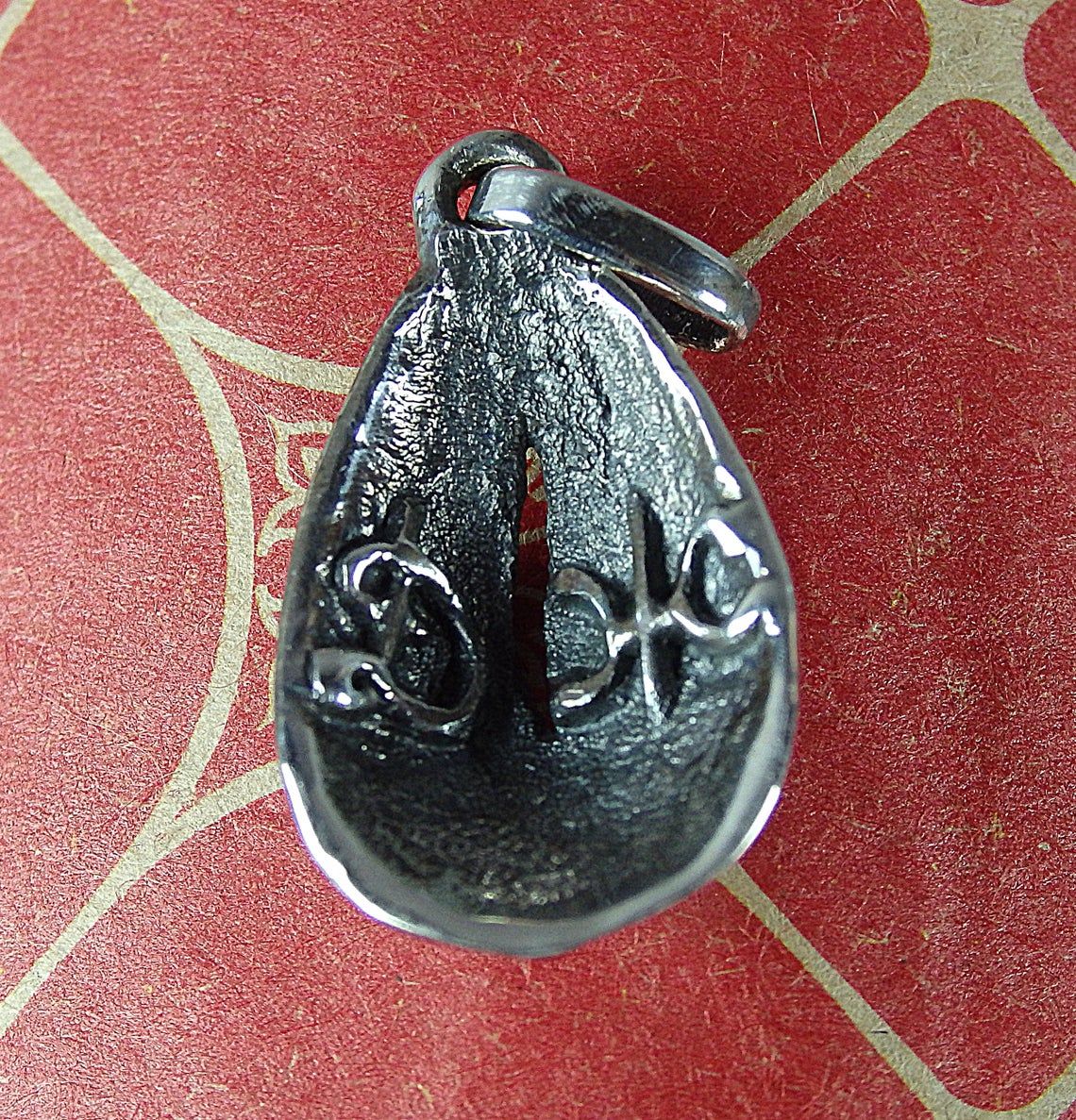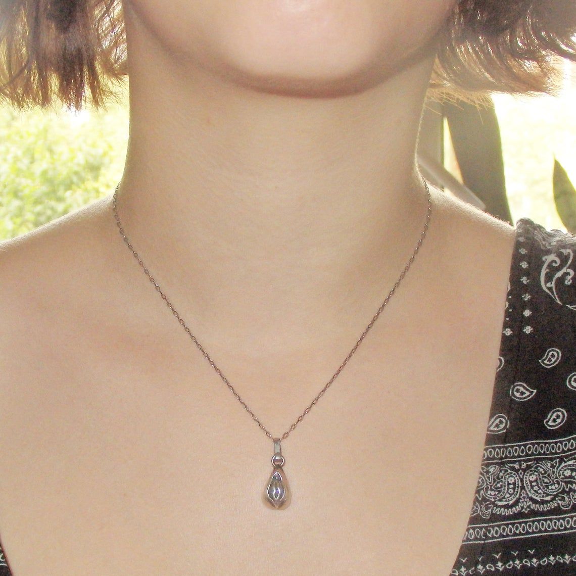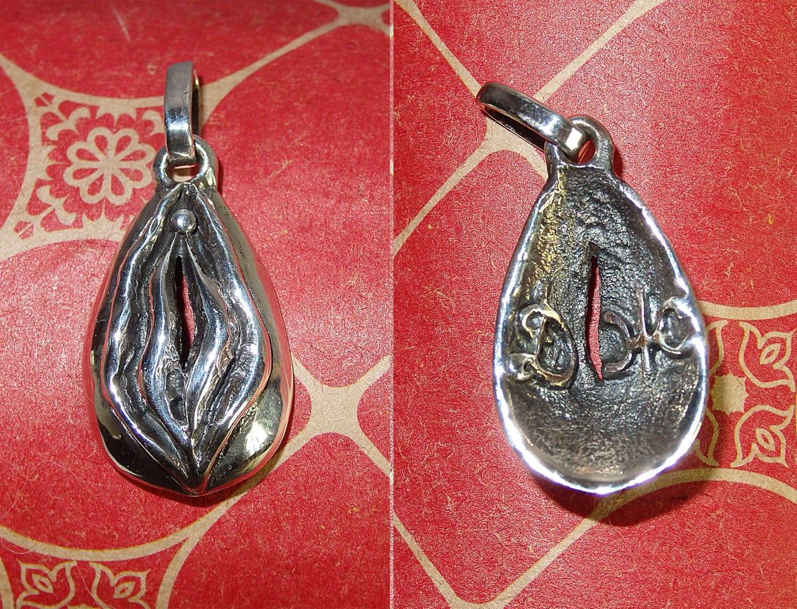 Small silver pendant in the shape of a vagina. Silver jewelry with the initials of a loved one on the inside of the pendant.