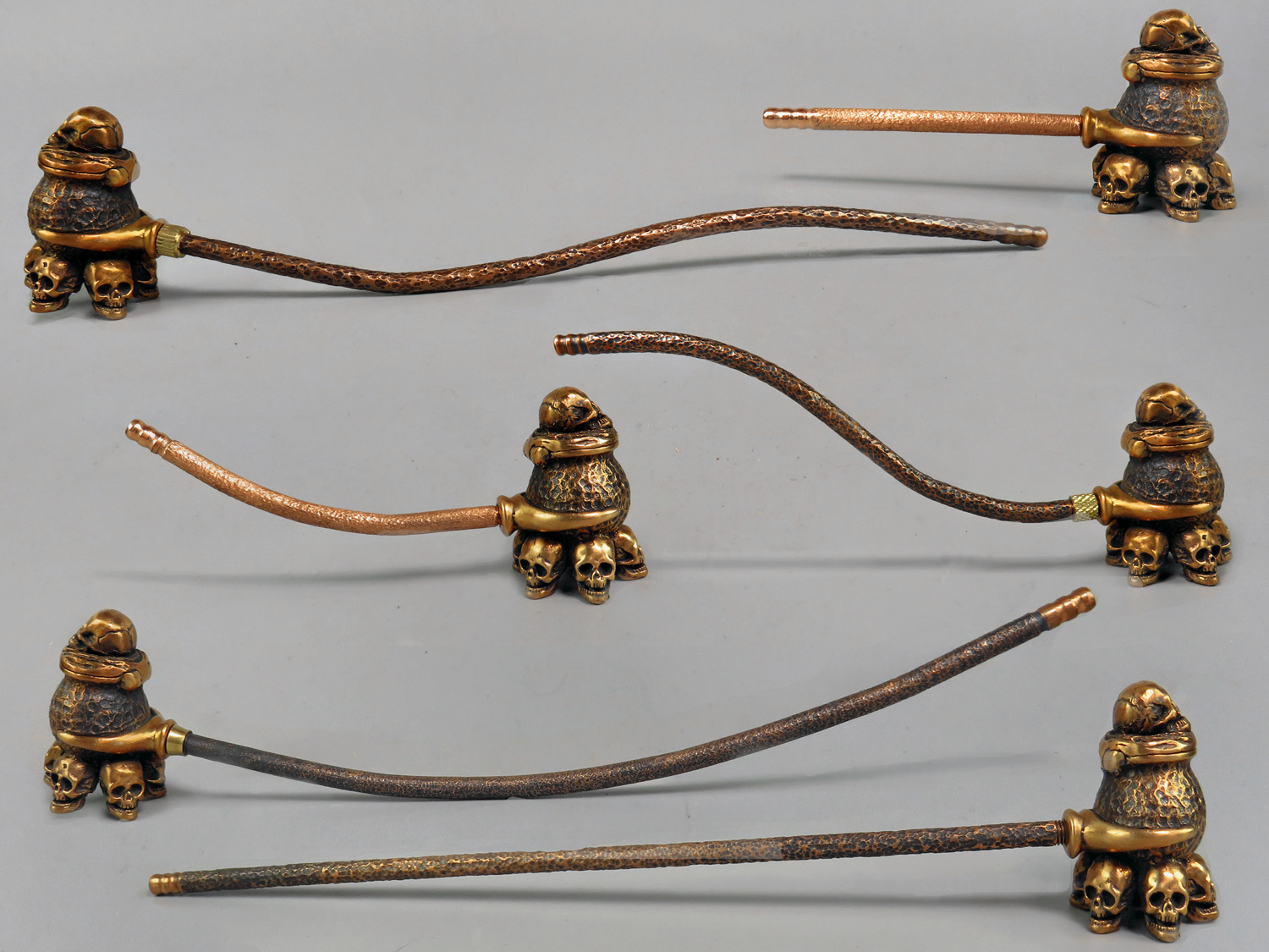 The mouthpiece is made of copper, it is screwed on, can have a length (from 3 to 30 cm) and a shape at the request of the buyer. The pipe is working, not decorative, the model is tested by the master.