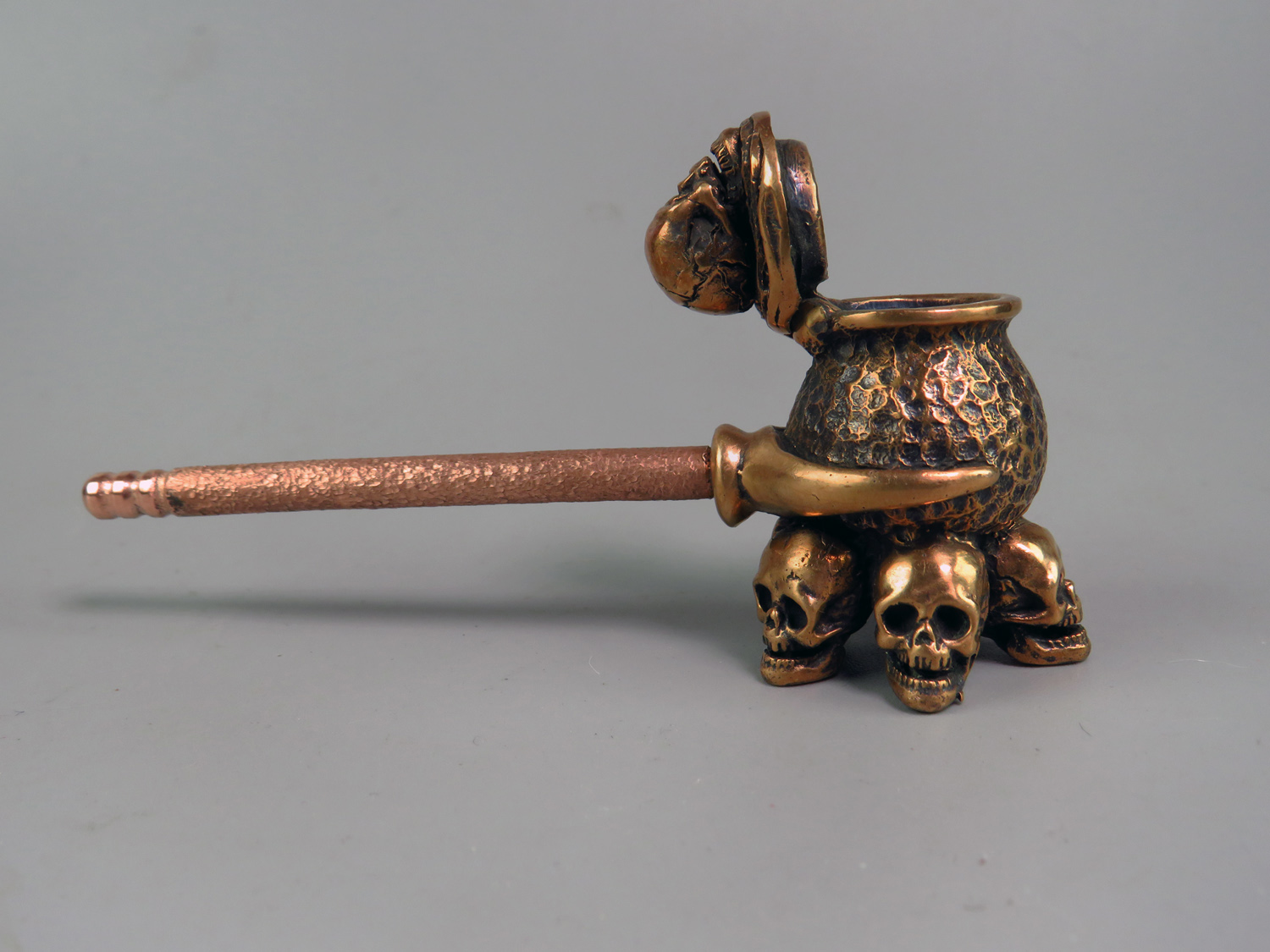 A capacious heavy pipe in the shape of a pot with skulls, on the theme of piracy or brutal gothic. This pipe will be a great thematic gift for the Day of the Dead (Día de Muertos), Halloween, carnival, Comic Con and the like.
