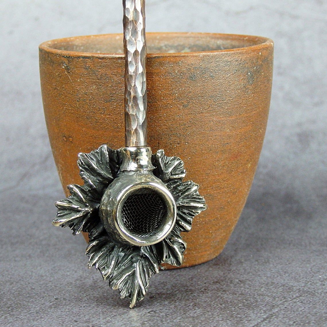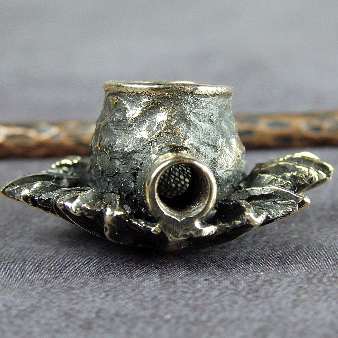 Bronze smoking pipe with a bowl in the shape of pot on the leaf. The mouthpiece is made of copper, it is screwed on, can have a length (from 3 to 30 cm) and a shape at the request of the buyer. The pipe is working, not decorative, the model is tested by the master.