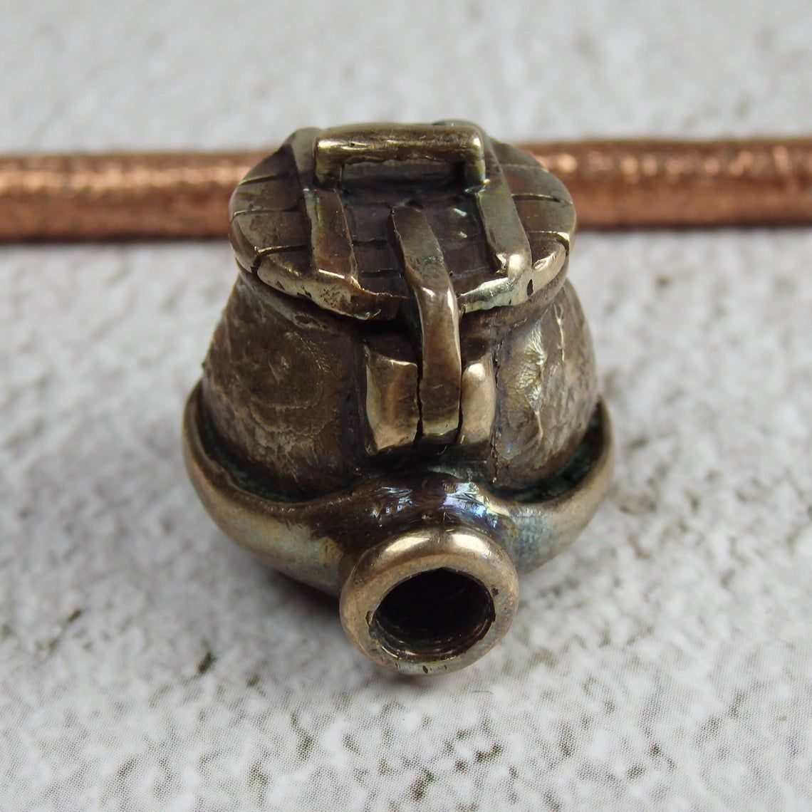 Bronze smoking pipe with a bowl in the shape of a pot with a lid.T his is the simplest and most convenient model, suitable for everyone, just remember that this pipe can stand on a plane only with a straight mouthpiece. The mouthpiece is made of copper, it is screwed on, can have a length (from 3 to 30 cm) and a shape at the request of the buyer.