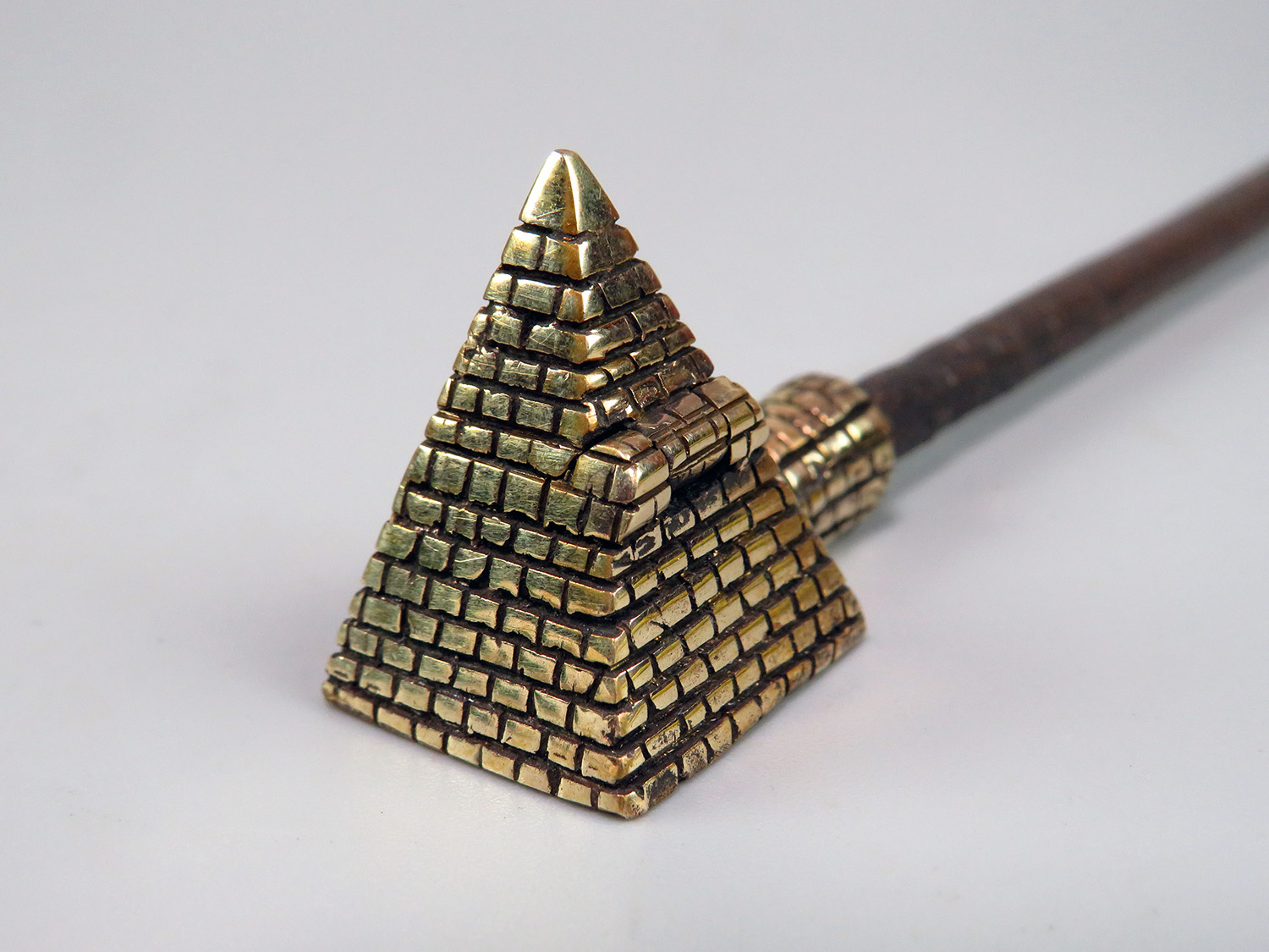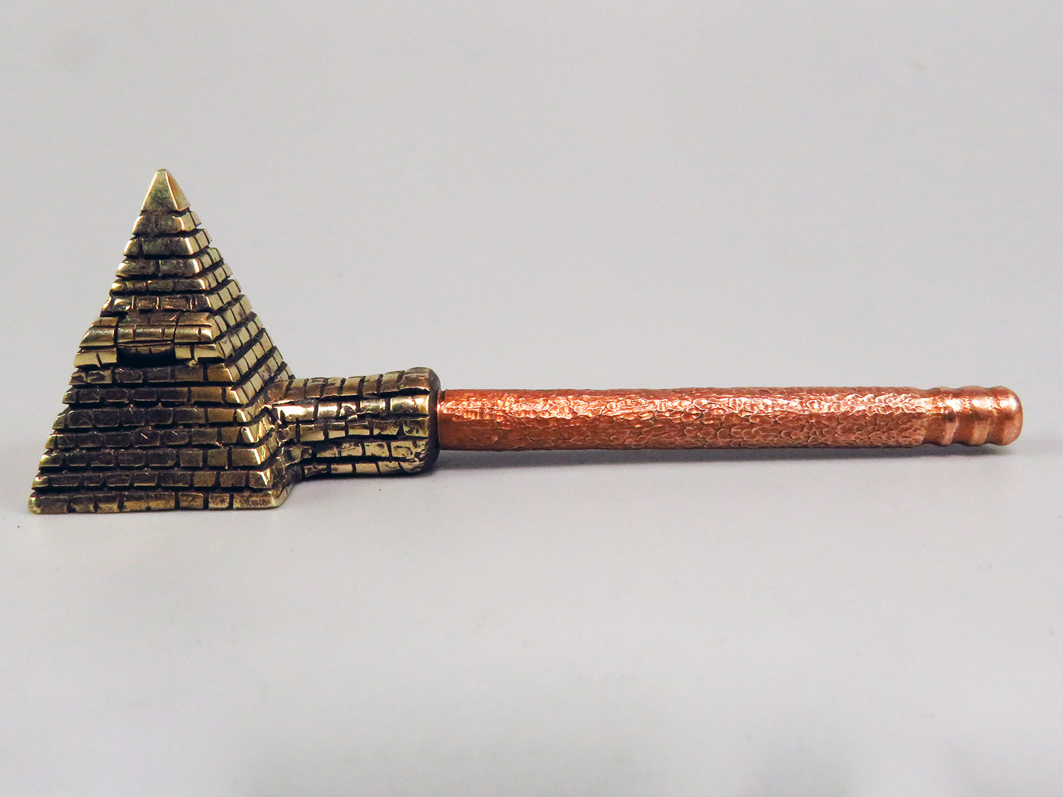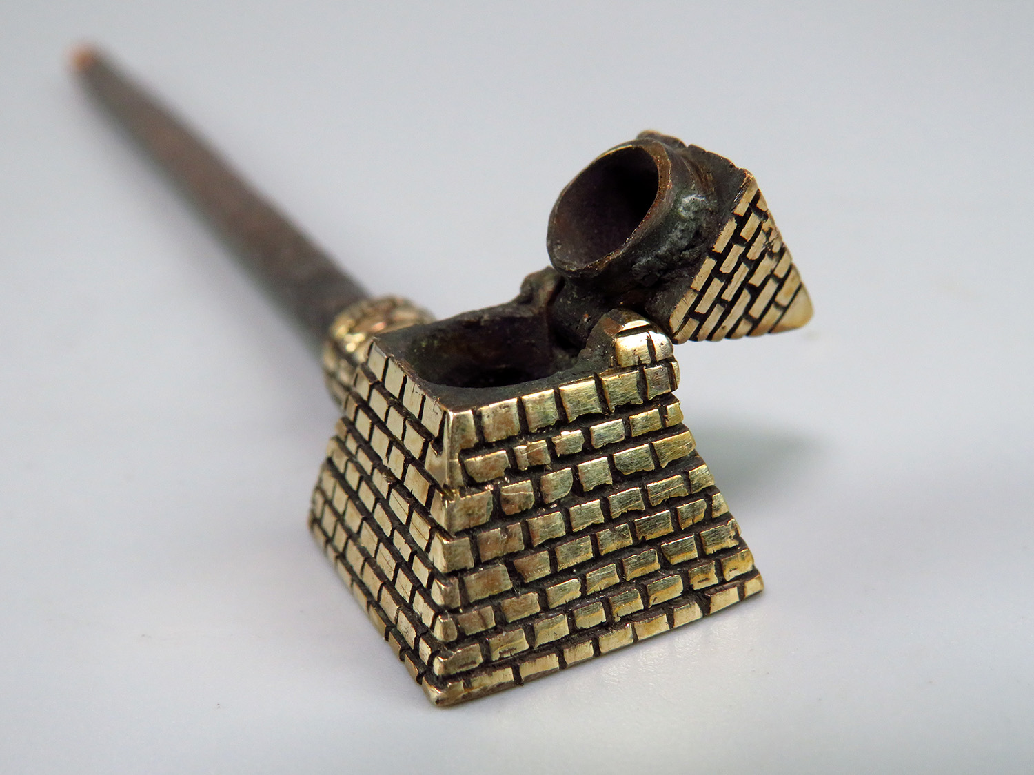 A small bronze pipe in the shape of an Egyptian pyramid. Note that this pipe has a lid that flips to the side. The mouthpiece is made of copper, it is screwed on, can have a length (from 3 to 30 cm) and a shape at the request of the buyer.