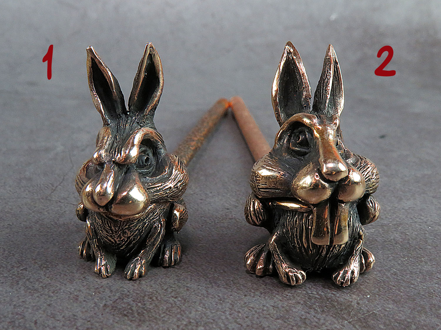 A bronze smoking pipe in the shape of a cute rabbit. 2023 is the Year of the Rabbit in the Chinese zodiac and a symbol of luck, longevity, and abundance in feng shui. Therefore, this pipe makes an excellent gift for those who believe in fate and good fortune. There are two models to choose from - with teeth outside and inside. The price is for one pipe assembly. When ordering, please indicate the mould you prefer.