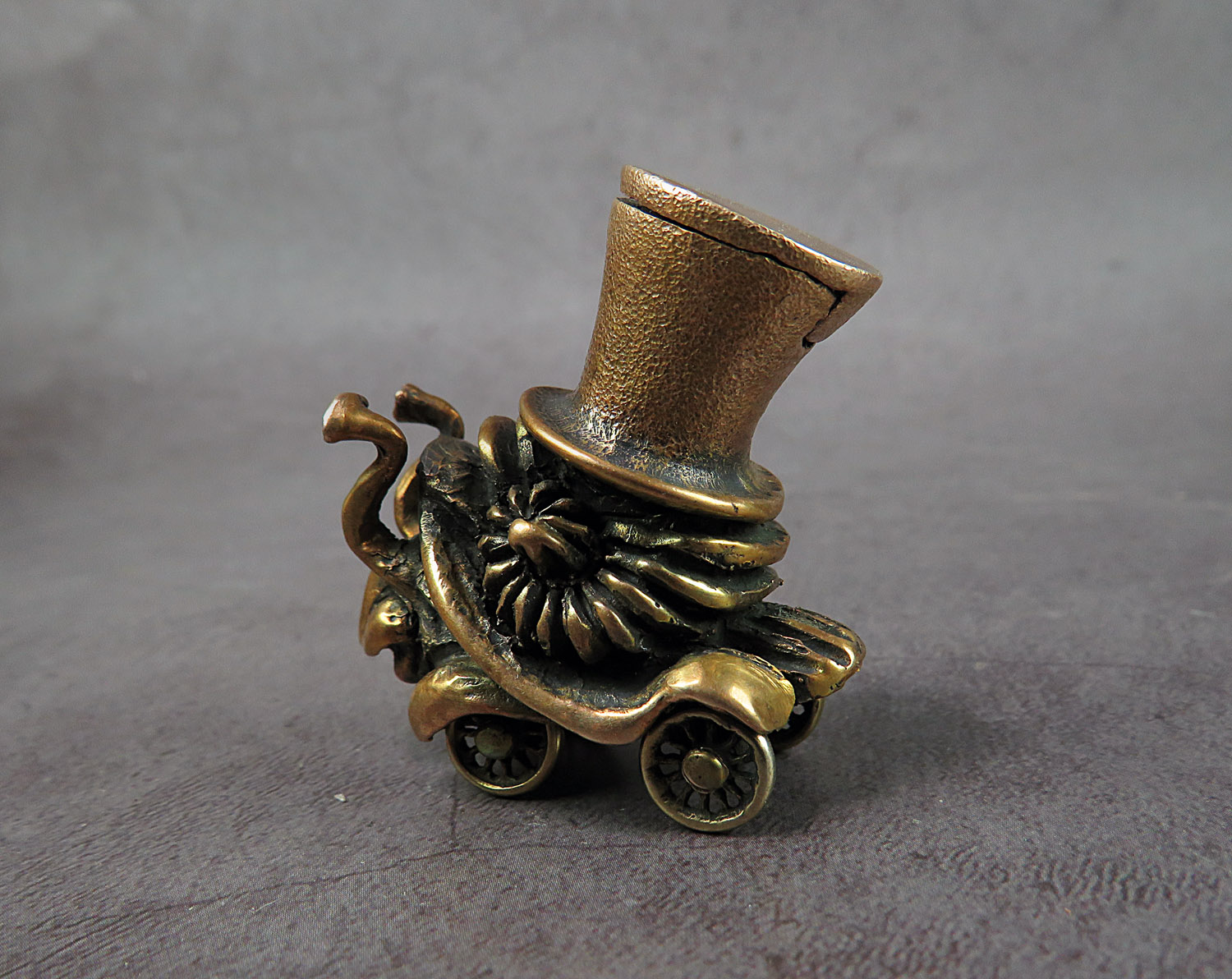 A funny tiny moving bronze snail in a cylinder and on wheels, a postmodern symbol of our time.