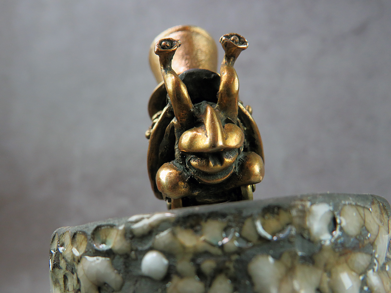 To make this item, a wax model was cut out by hand. Then, using the lost wax method, bronze parts were cast.