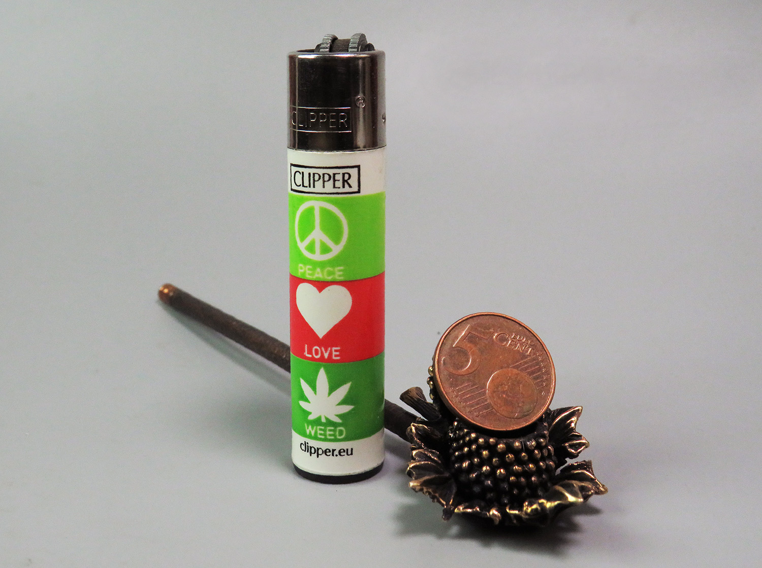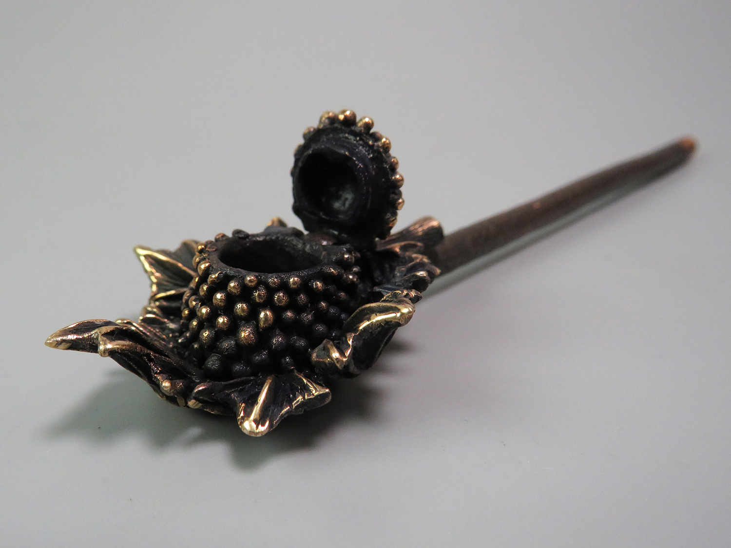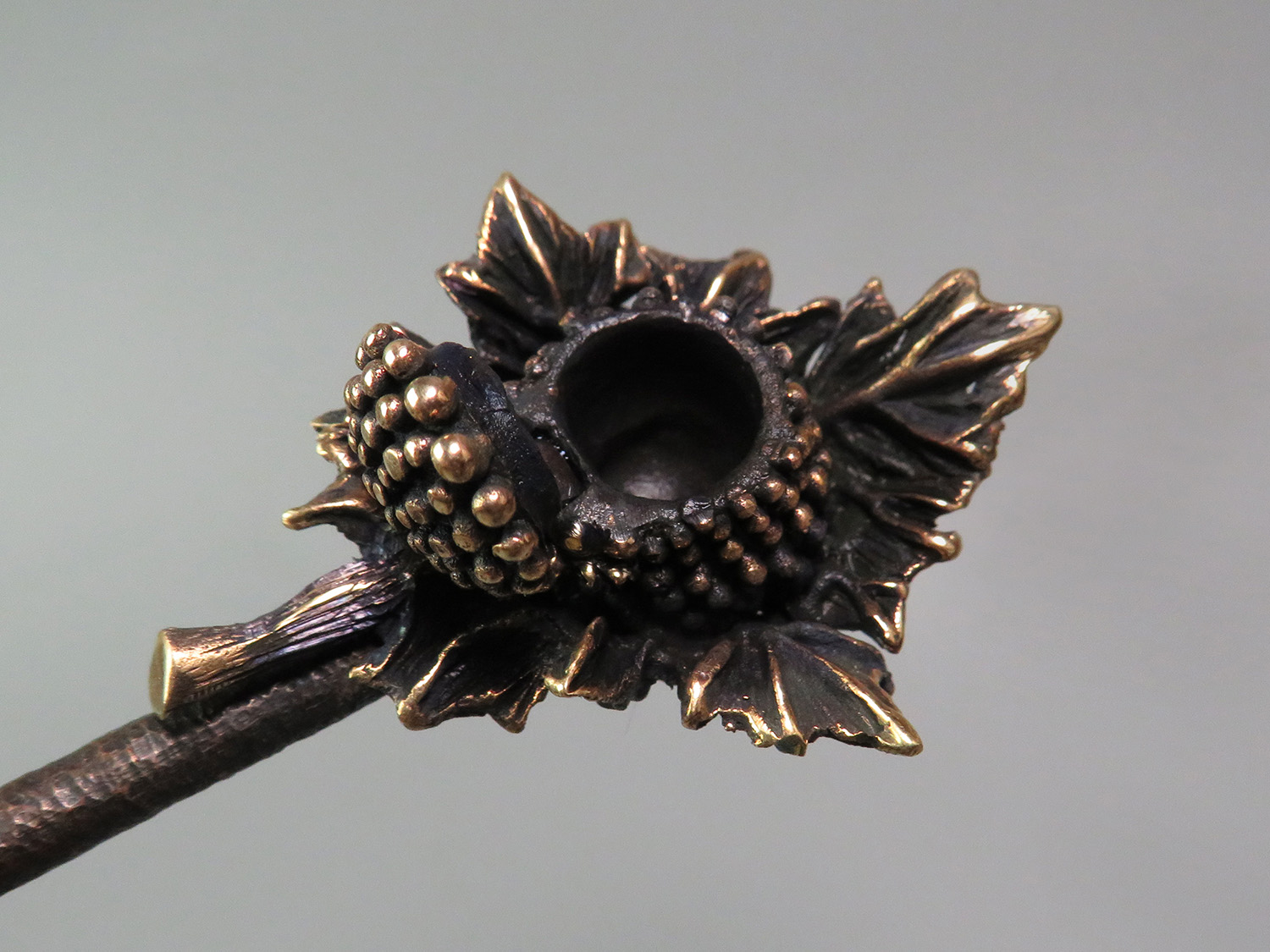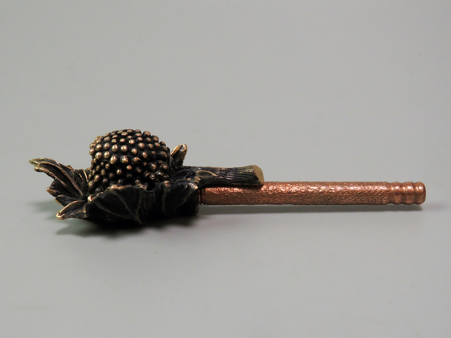 A bronze pipe shaped like a berry resting on a leaf, evoking warm summers and carefree holidays.