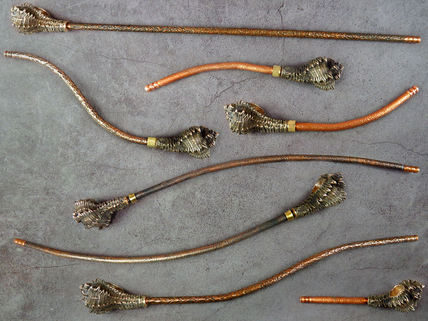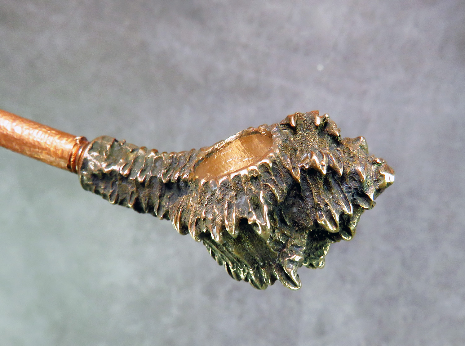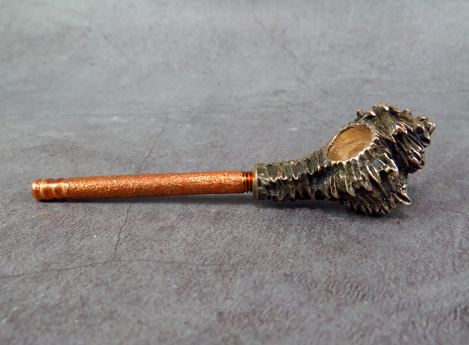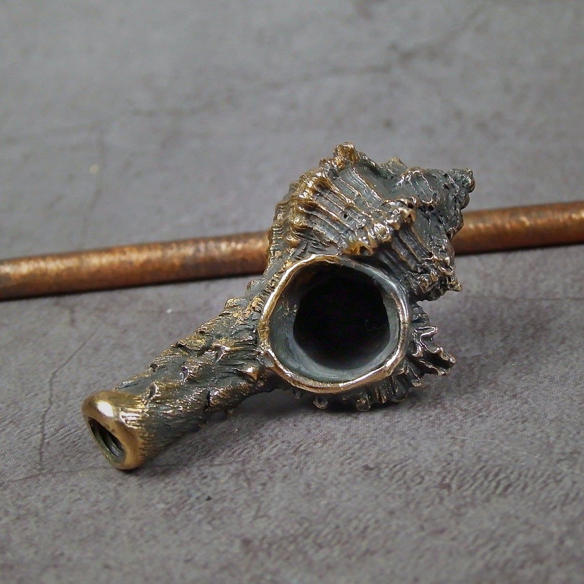 Bronze smoking pipe with a bowl in the shape of Sea shell. The mouthpiece is made of copper, it is screwed on, can have a length (from 3 to 30 cm) and a shape at the request of the buyer. The pipe is working, not decorative, the model is tested by the master.
