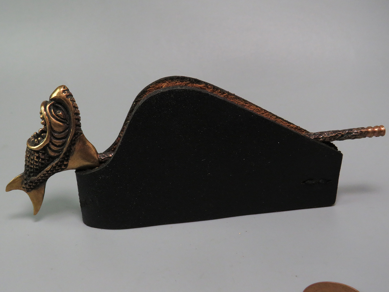 To make this item, a wax model was cut out by hand. Then, using the lost wax method, bronze parts were cast.