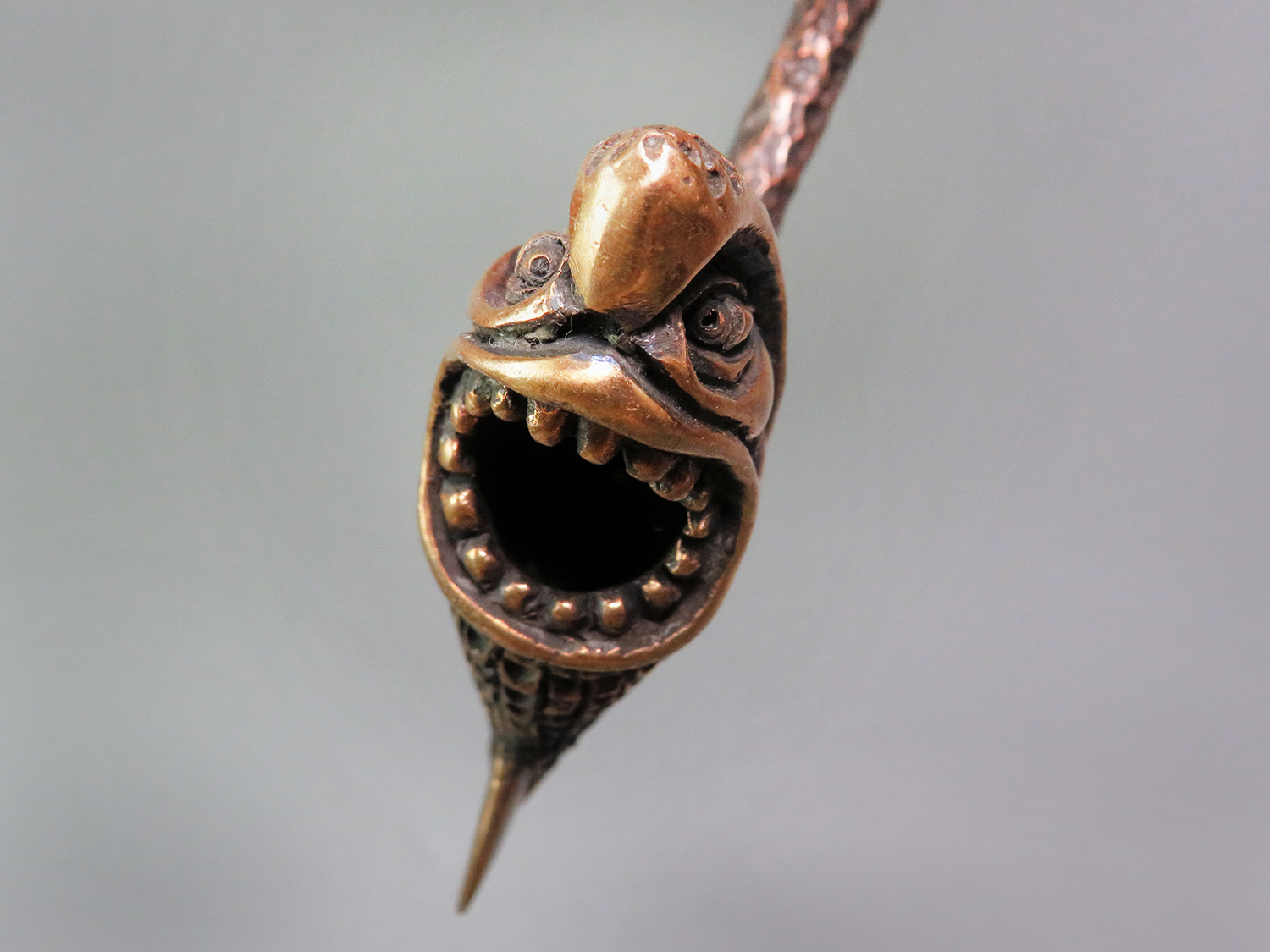 A small bronze pipe with a bowl shaped like a shark with its jaws wide open. It will appeal to those who love speed, brutality, and, of course, the sea.