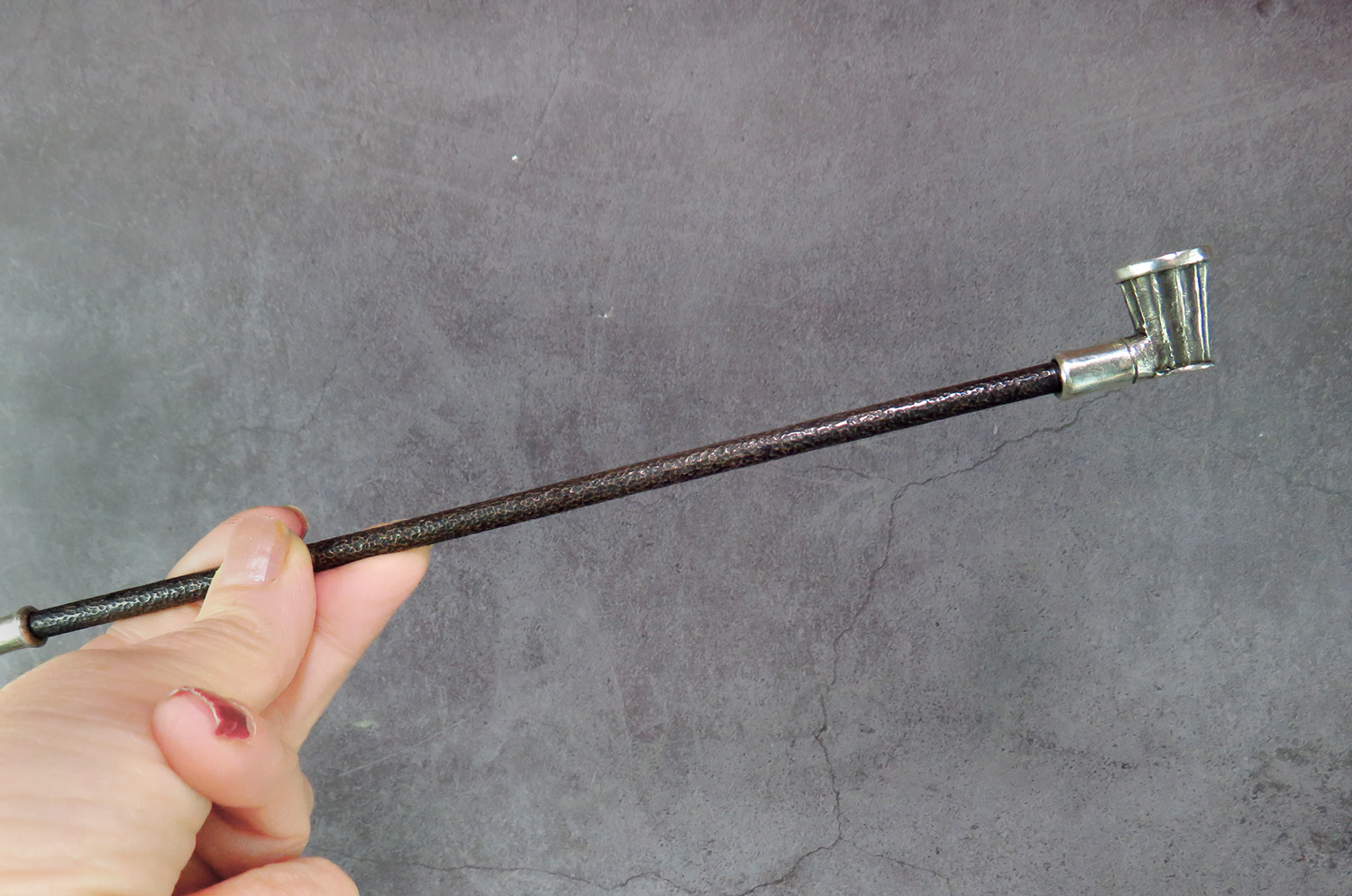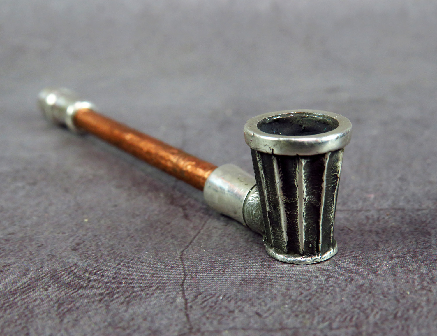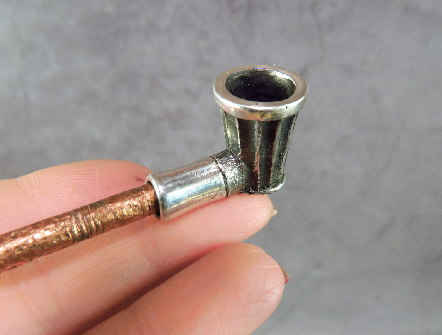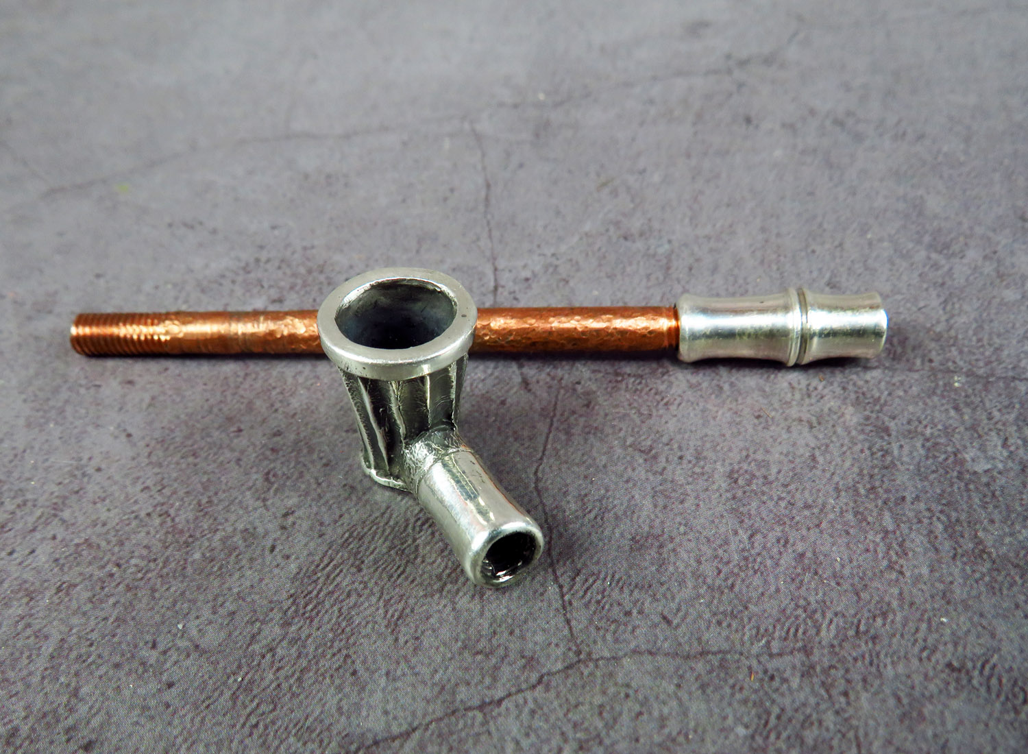 The mouthpiece is made of copper and silver, screwed on, can have a length (from 3 to 30 cm) and a shape at the request of the buyer. The pipe is working, not decorative, the model is tested by the master.