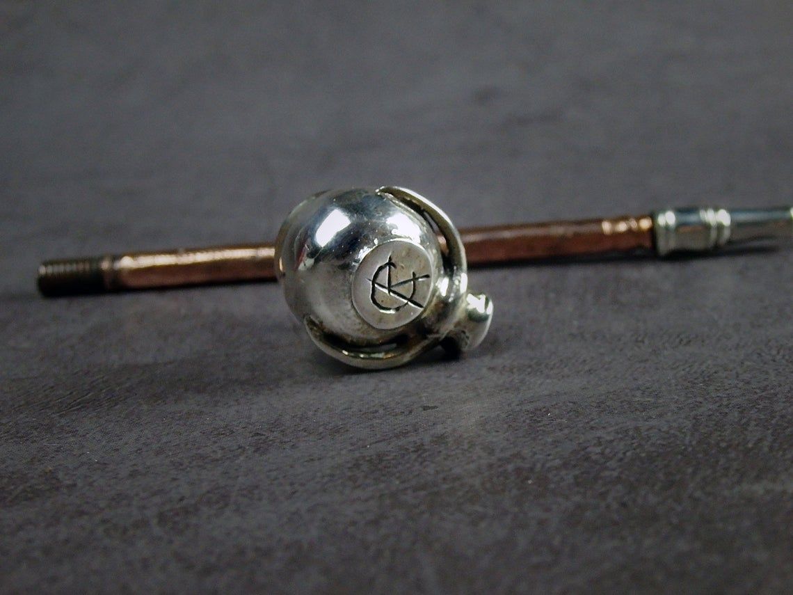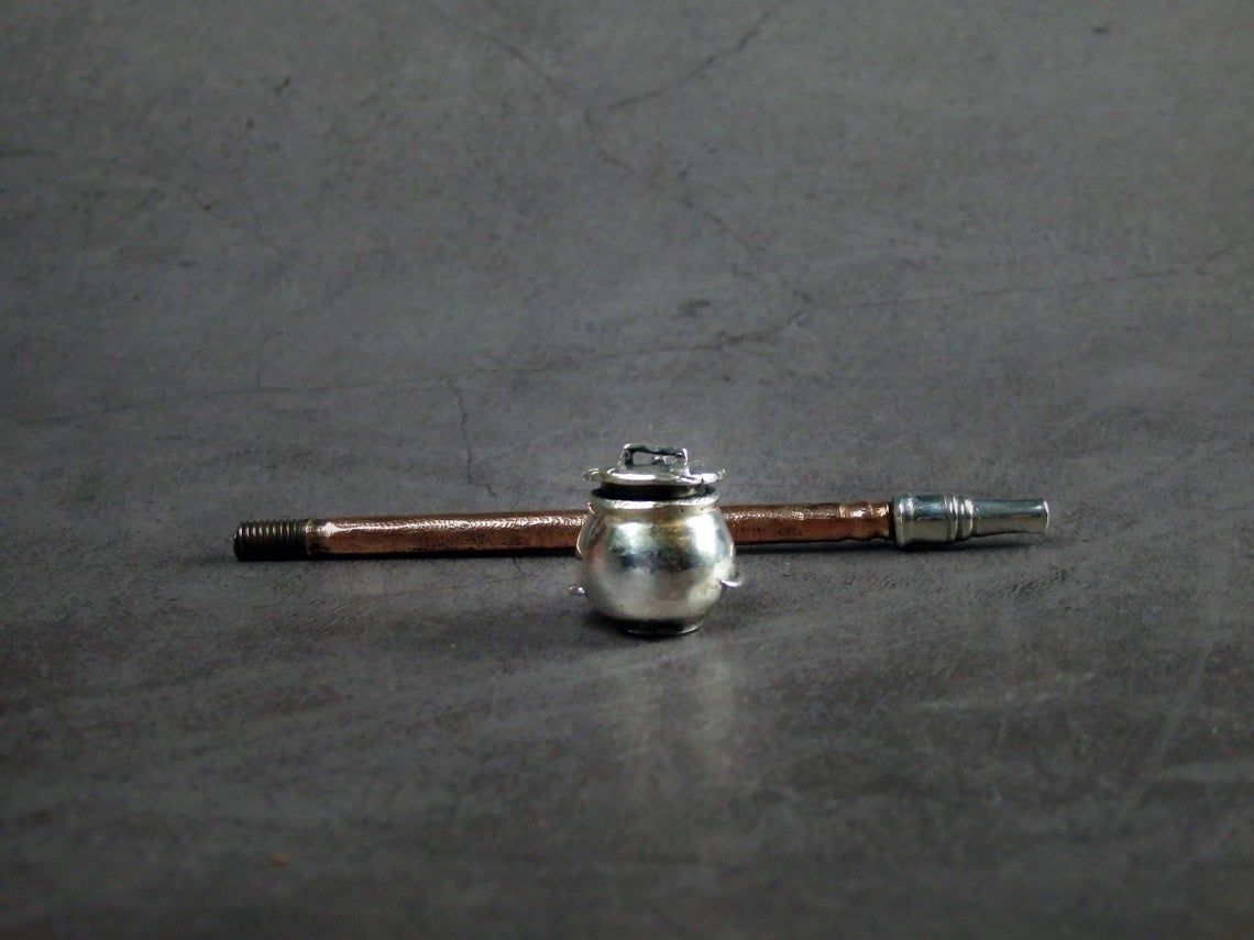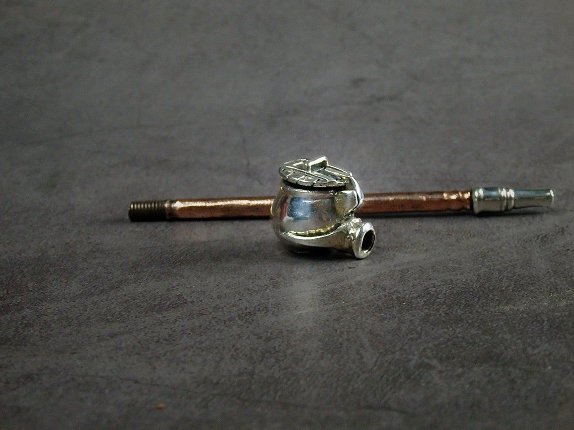 Handmade silver smoking pipe with a bowl in the shape of a pot with a lid. The mouthpiece is made of copper and silver, screwed on, can have a length (from 3 to 30 cm) and a shape at the request of the buyer. The pipe is working, not decorative, the model is tested by the master. Note! When choosing a mouthpiece, keep in mind that this pipe can stand on a plane only with straight mouthpiece.