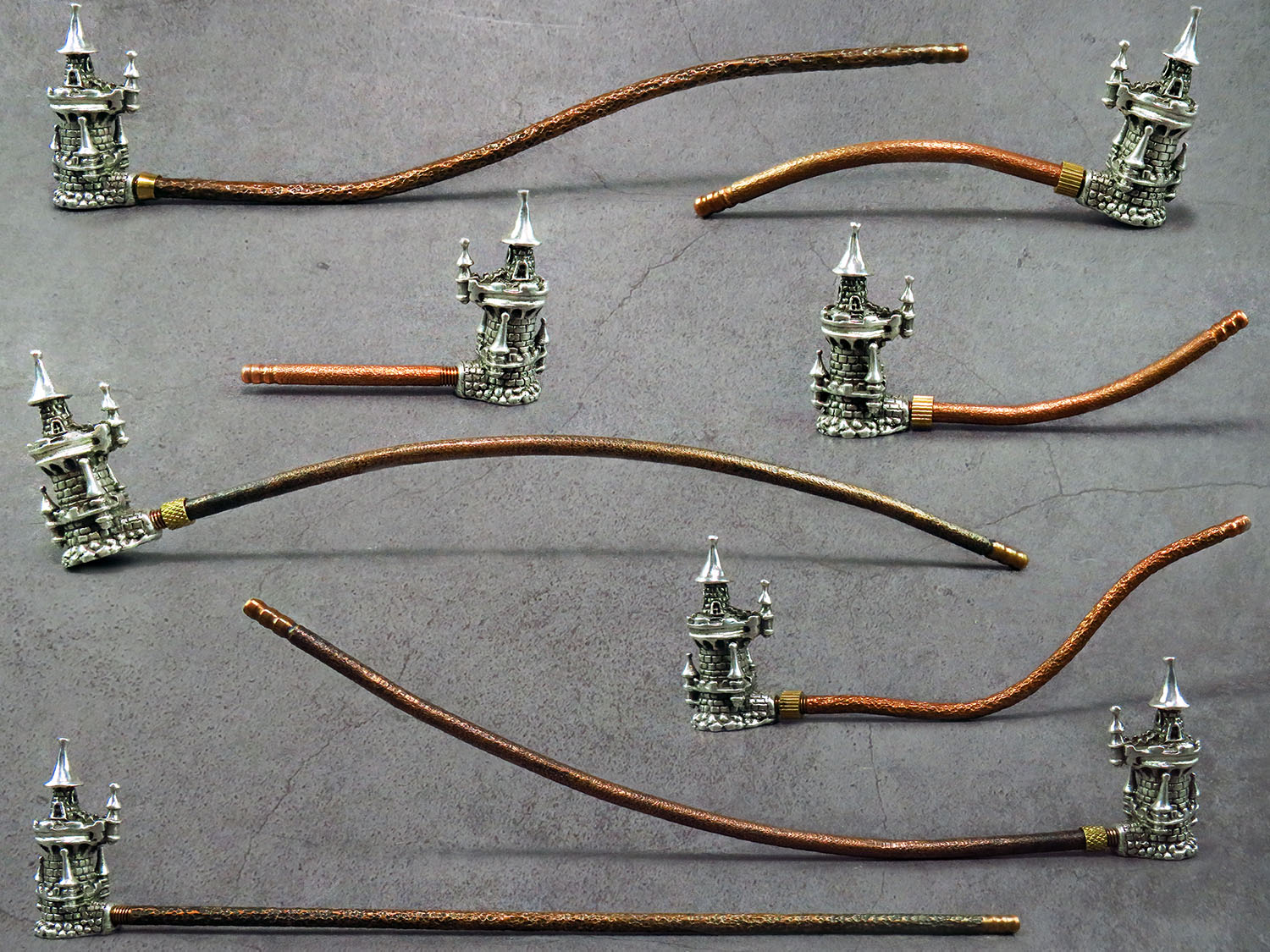 The mouthpiece is made of copper and silver, screwed on, can have a length (from 3 to 30 cm) and a shape at the request of the buyer. The pipe is working, not decorative, the model is tested by the master.
