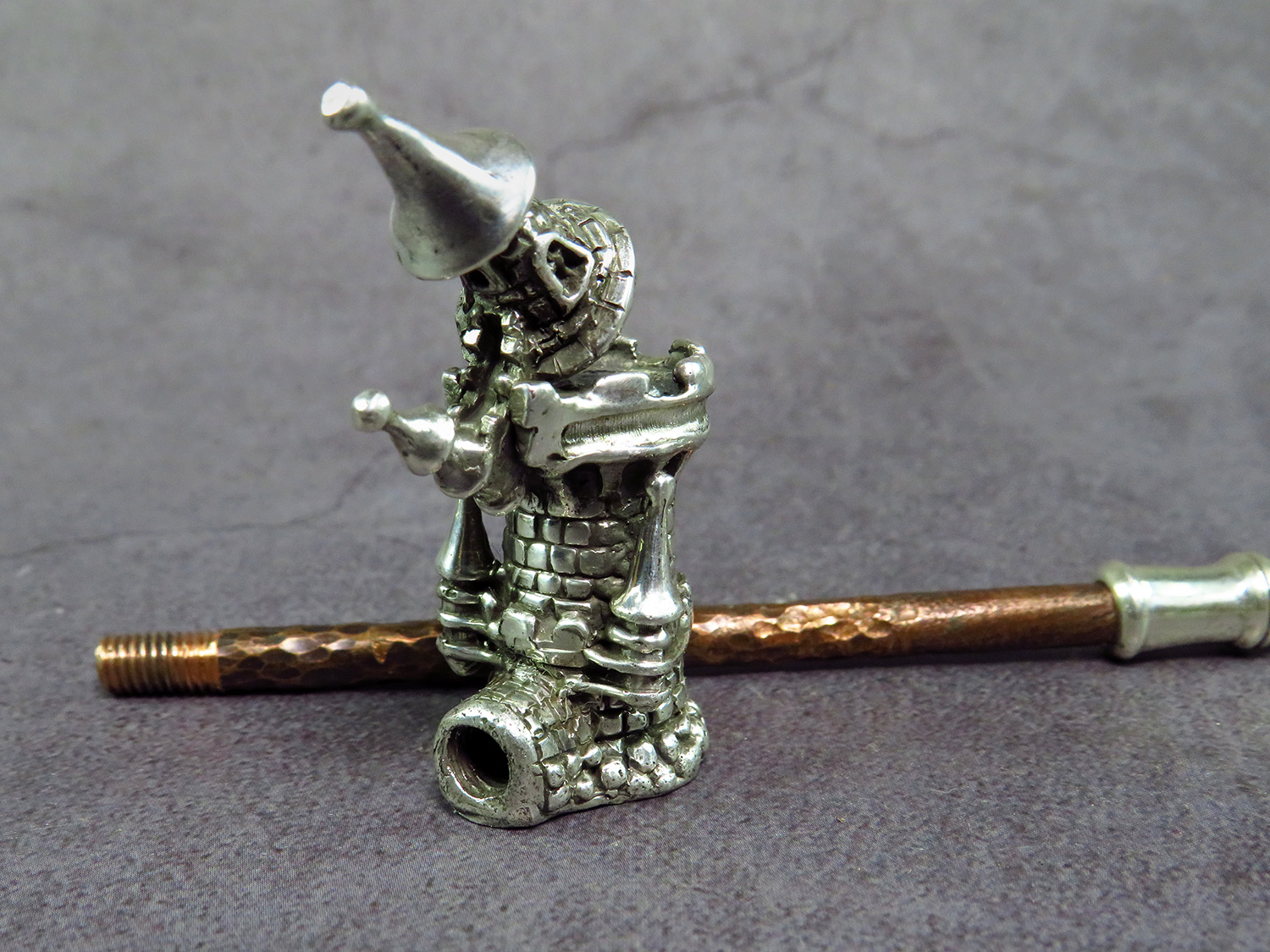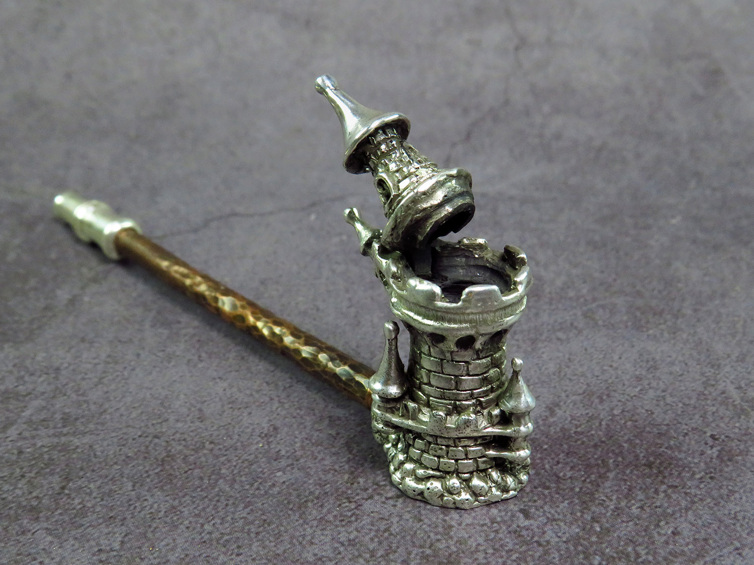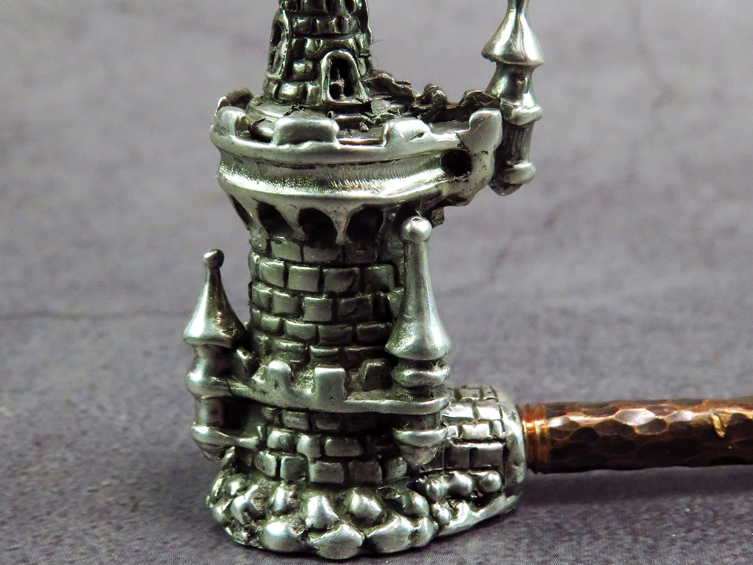Handmade silver smoking pipe in the shape of watchtower with roof - lid.