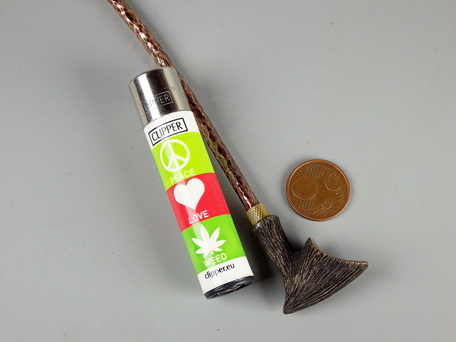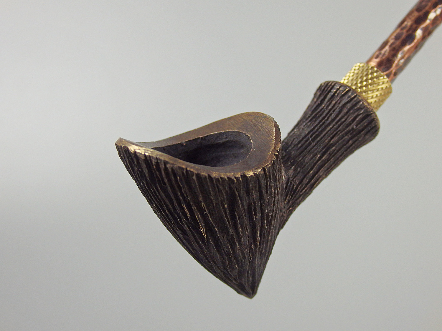 A small bronze pipe with a beveled edge and wood texture. The mouthpiece is made of copper, it is screwed on, can have a length (from 5 to 30 cm) and a shape at the request of the buyer. The pipe is working, not decorative, the model is tested by the master.