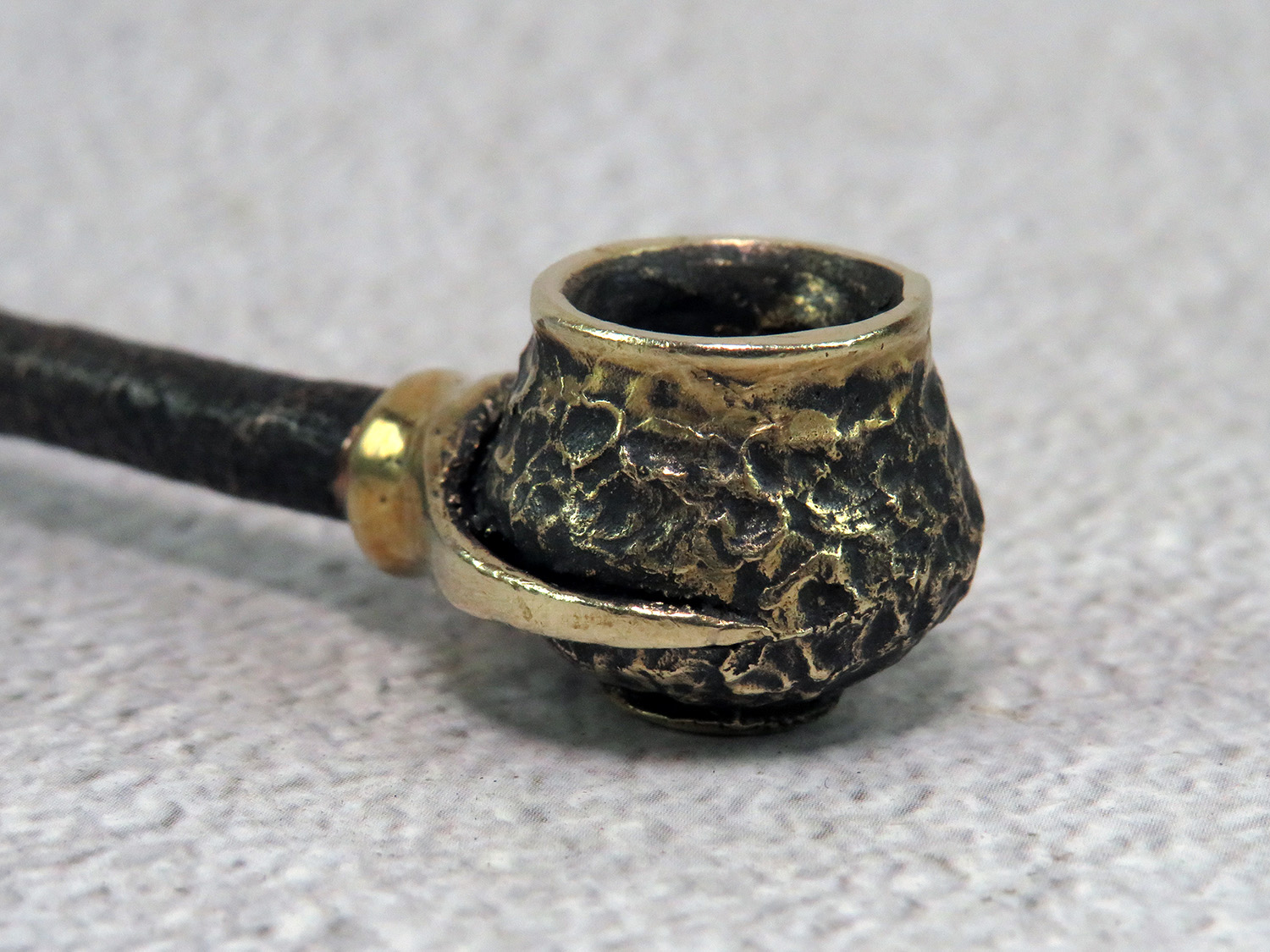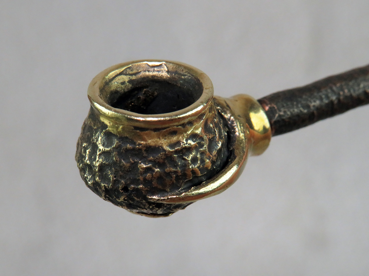 Simple small bronze pipe with a bowl in the shape pot with grip. The mouthpiece is made of copper, it is screwed on, can have a length (from 3 to 30 cm) and a shape at the request of the buyer.