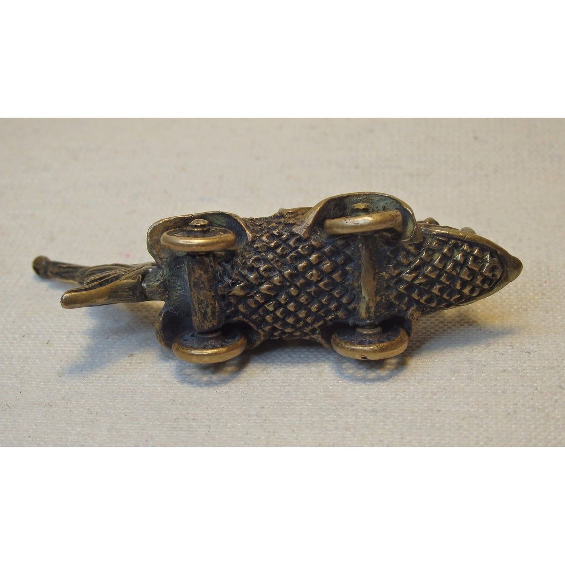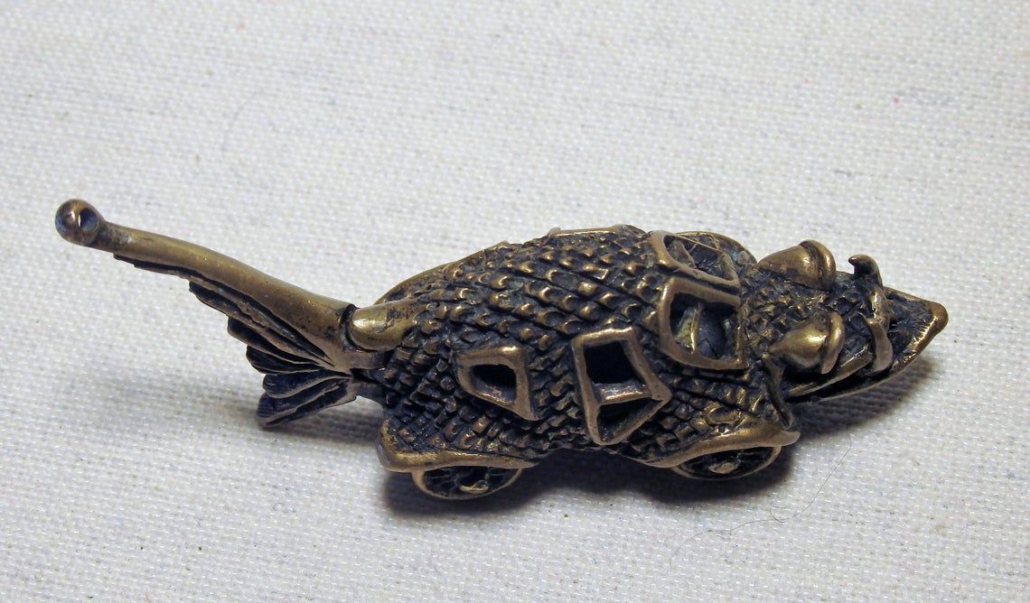 Small bronze souvenir toy. Fish-bus, miniature fish minivan - little funny bronze machine with a predatory fanged snout. The fish has real wheels and a moving fishtail. This toy can be rolled on the table or just admire.