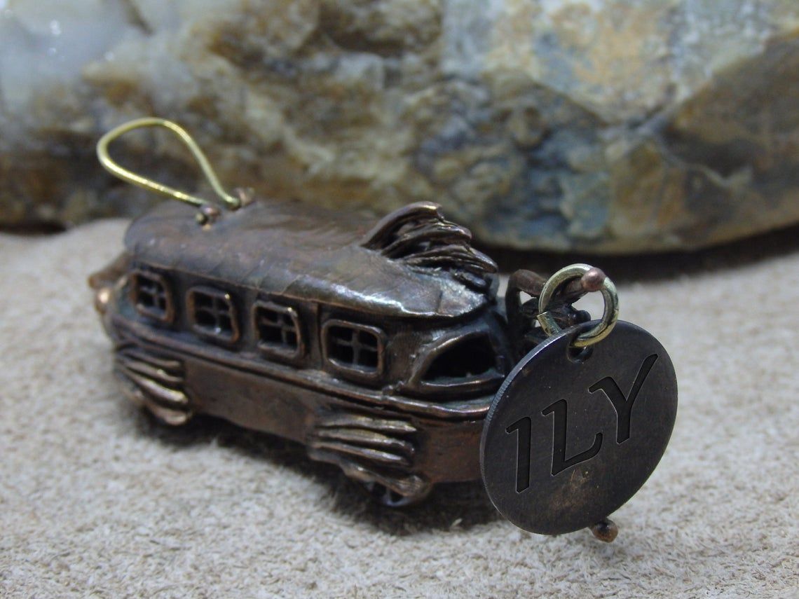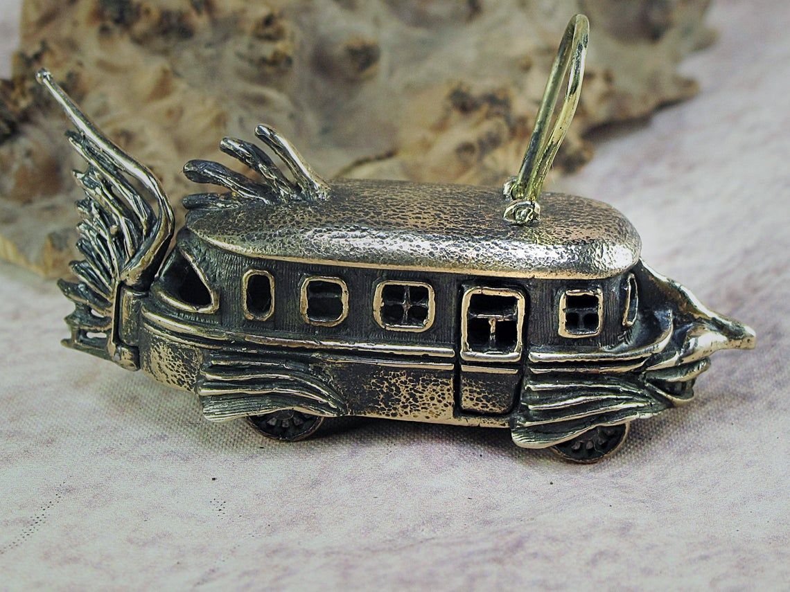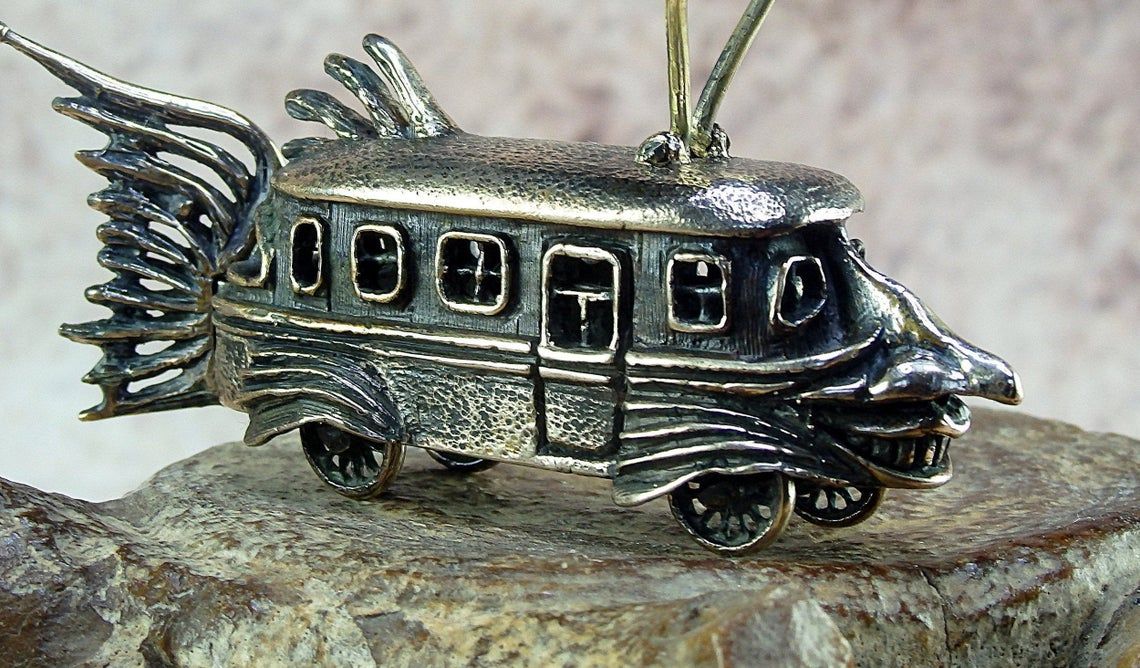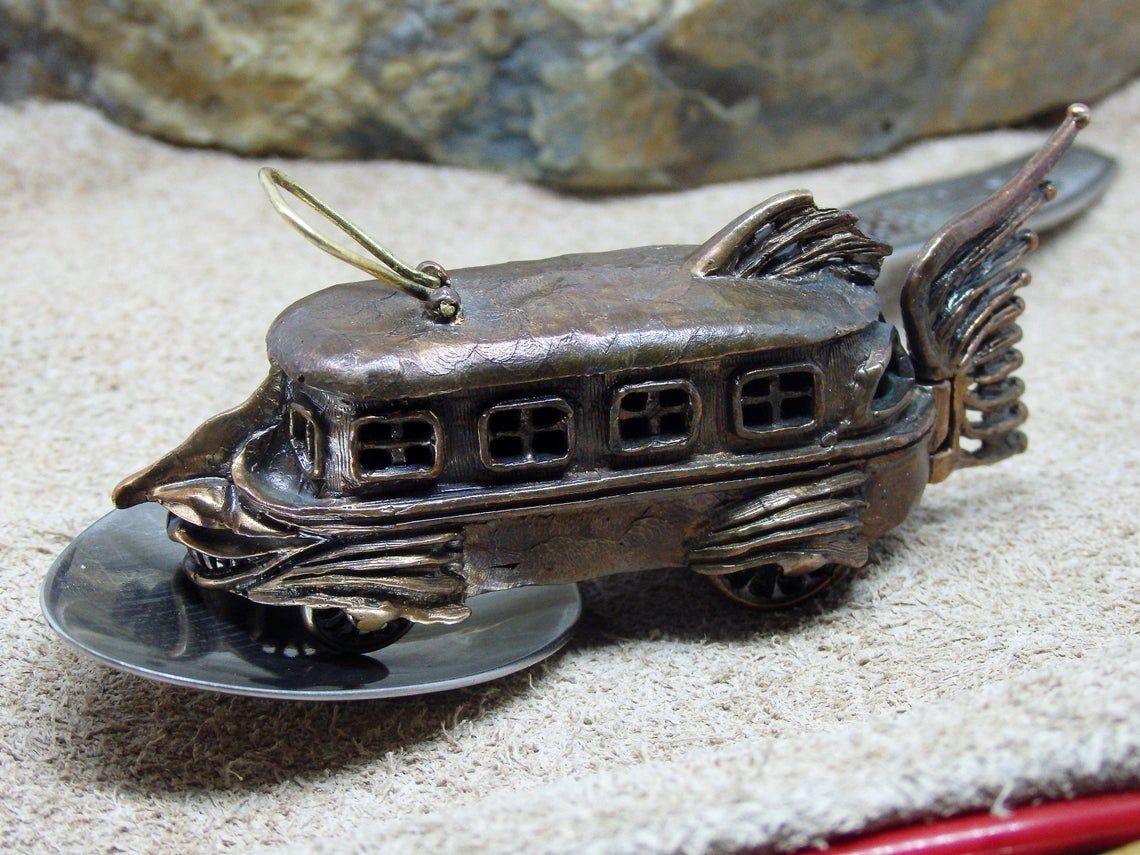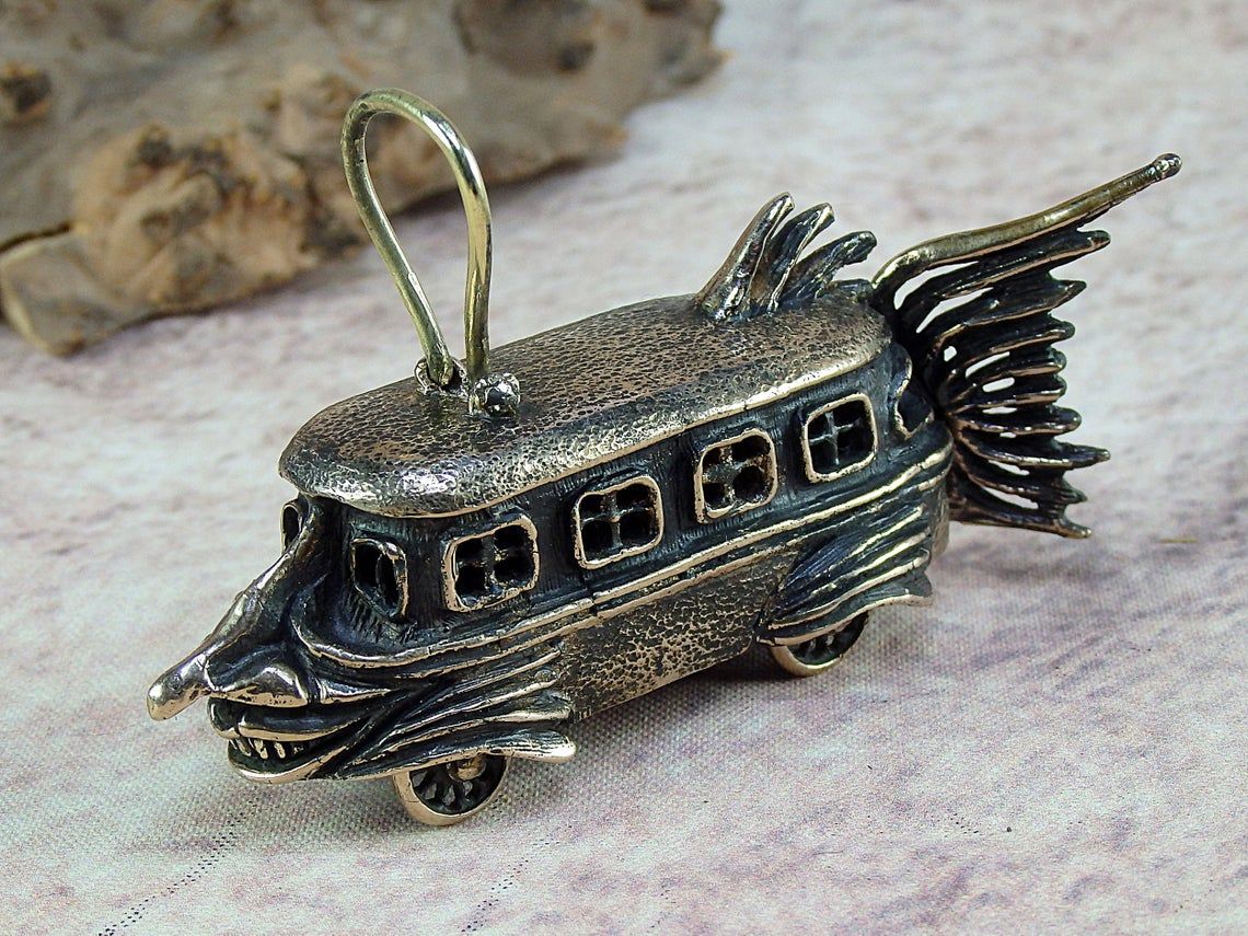 Small bronze souvenir toy. Fish-tram, miniature fish transport - a small fun bronze machine with a sly human face. The tram has real wheels and a moving fishtail. This toy can be rolled on the table or just admire.