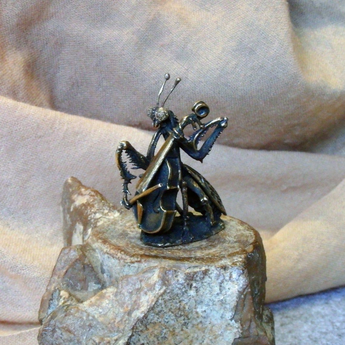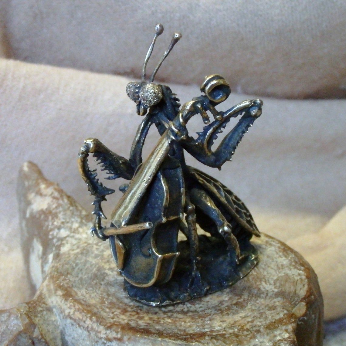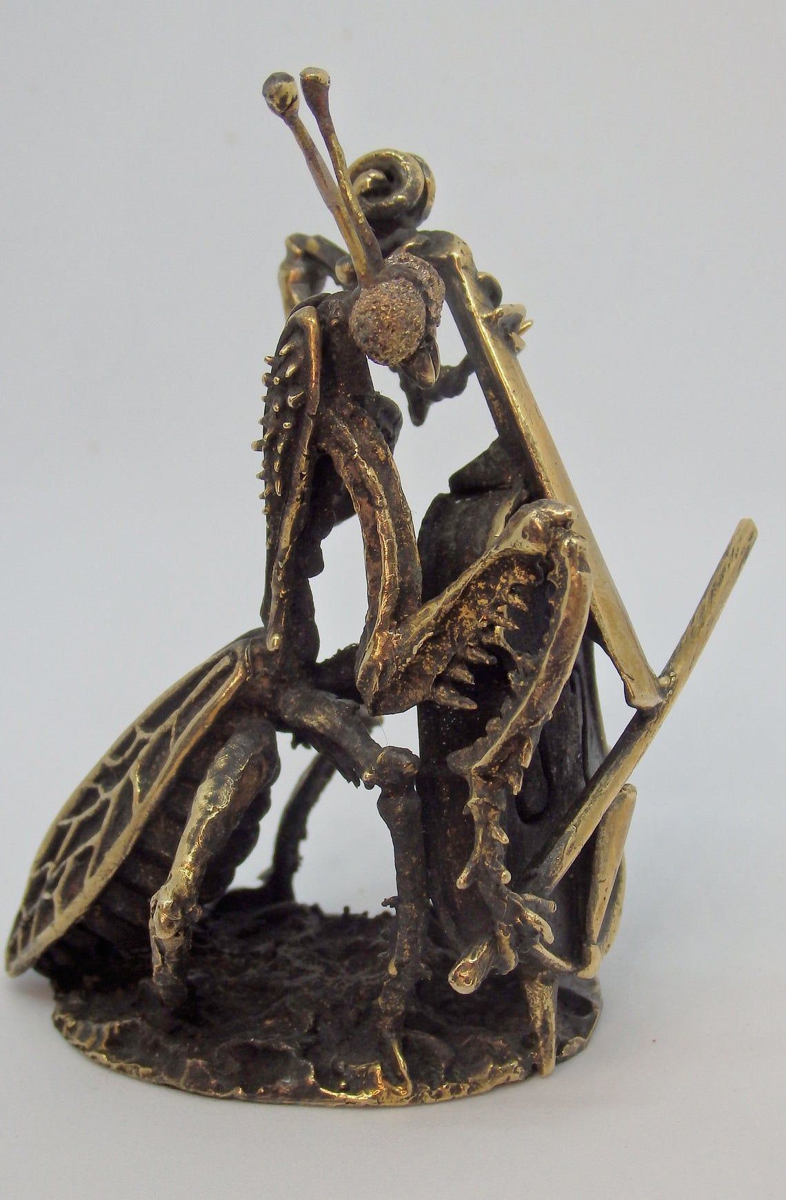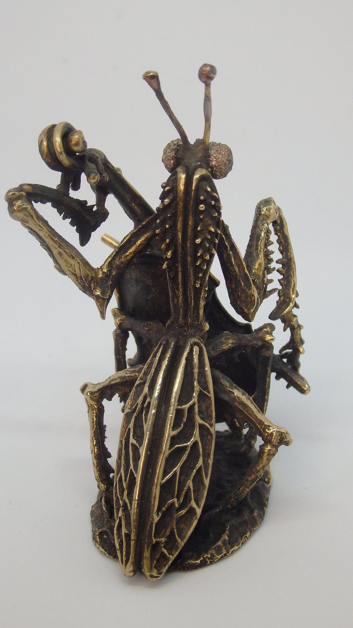 For the manufacture of mantis has been hand carved model from wax. After this, using the lost vax method, a metal blank was cast, which was then installation, minted, ground and polished. At last, patina is applied and a final soft polished is applied, to give the figurine its unique vintage look.