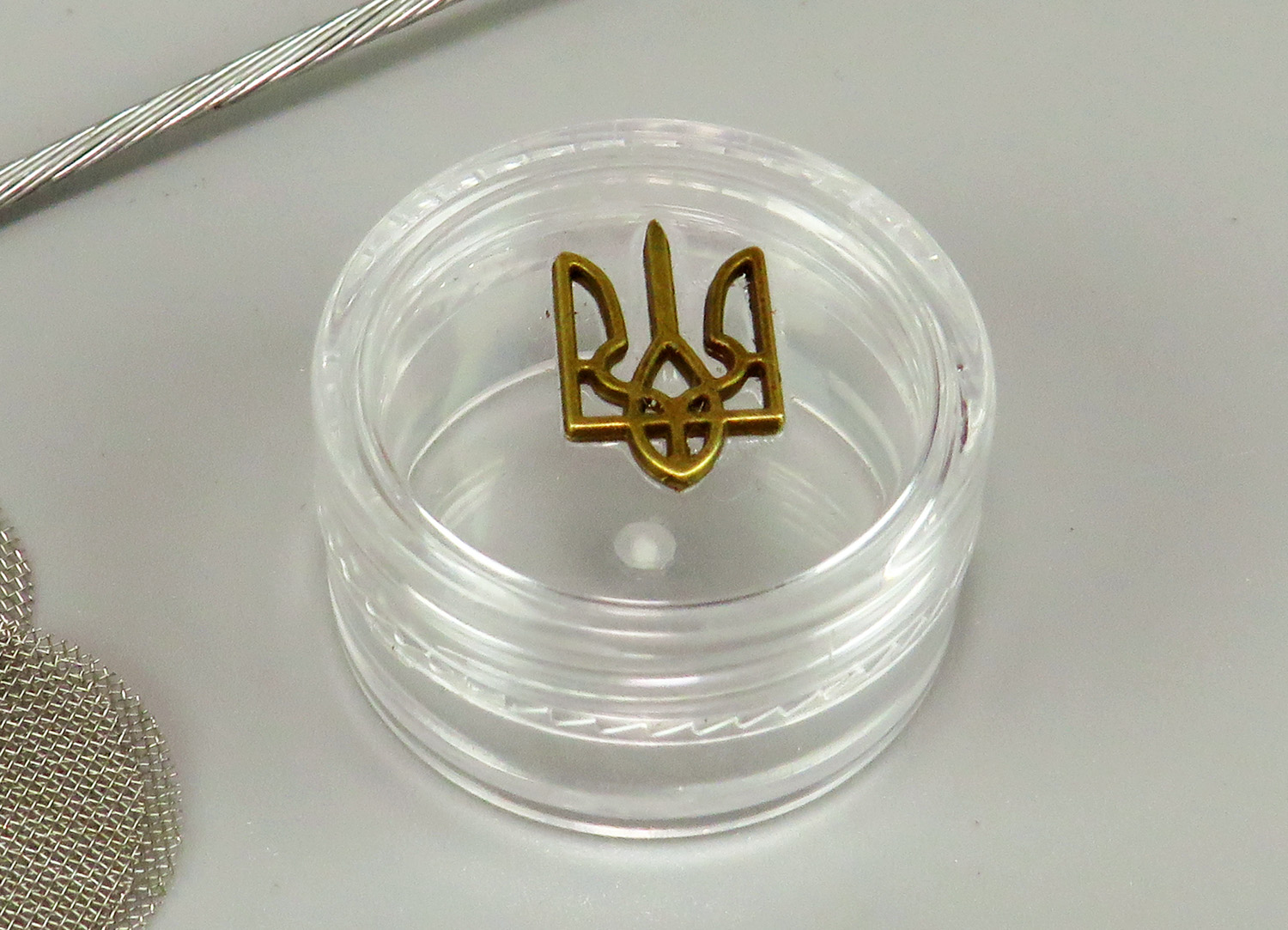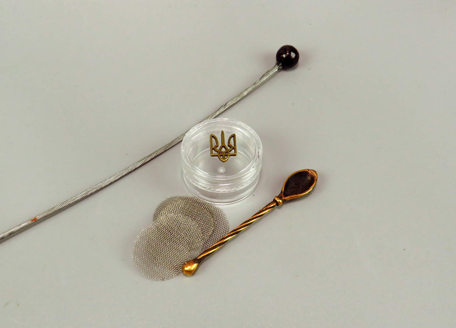 A set of spare pipe accessories consists of a cleaning rod (made of rope and bead), a miniature bronze spoon, 5 nets and a plastic container with the coat of arms of Ukraine.