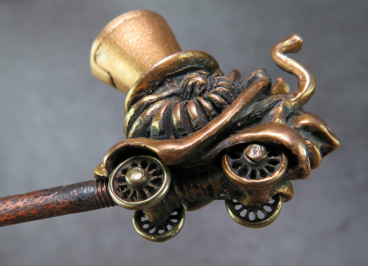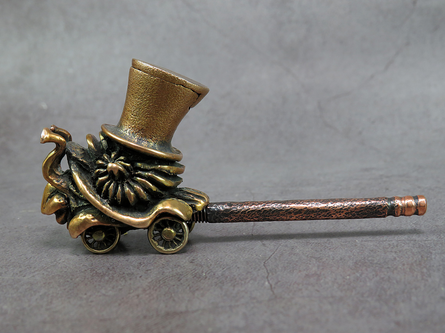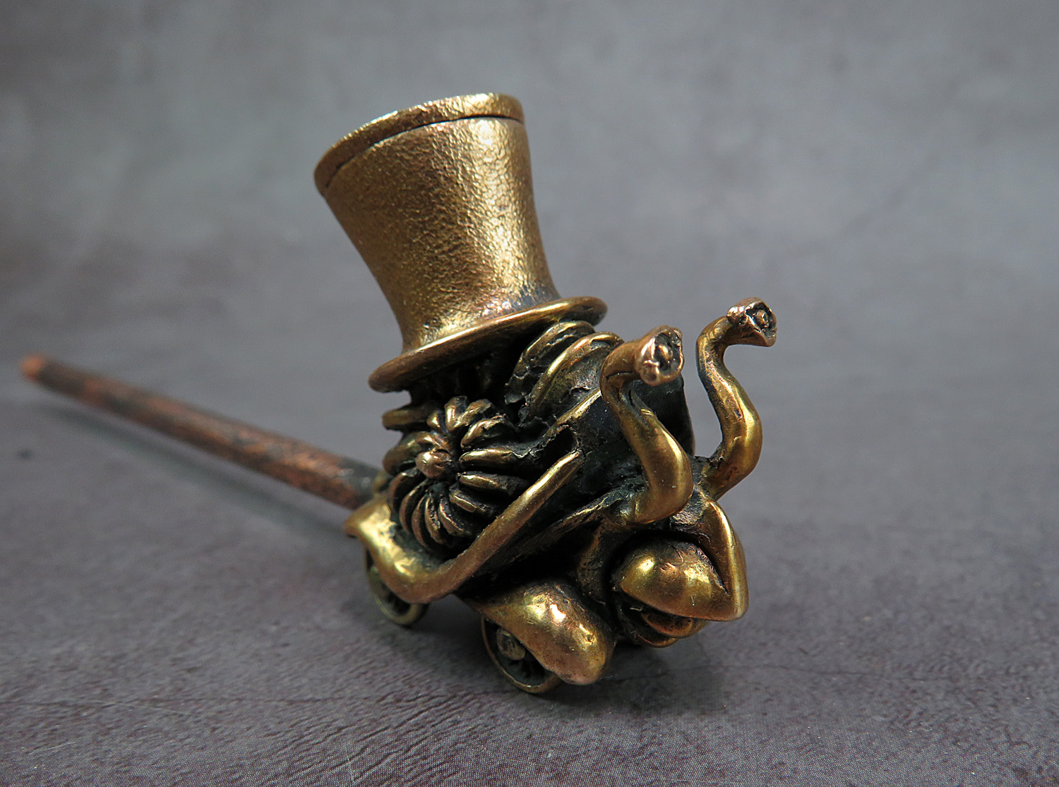Bronze smoking pipe in the form of a racing snail on wheels and in a cylinder. This pipe will be an excellent thematic gift for connoisseurs of postmodernism, novice drivers, cheerful travelers and collectors of outlandish things.