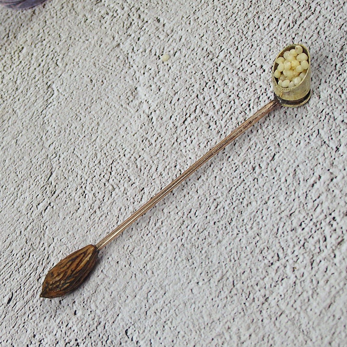 An original small souvenir spoon made from a cartridge case (from a luger) brass rod and an olive pit.