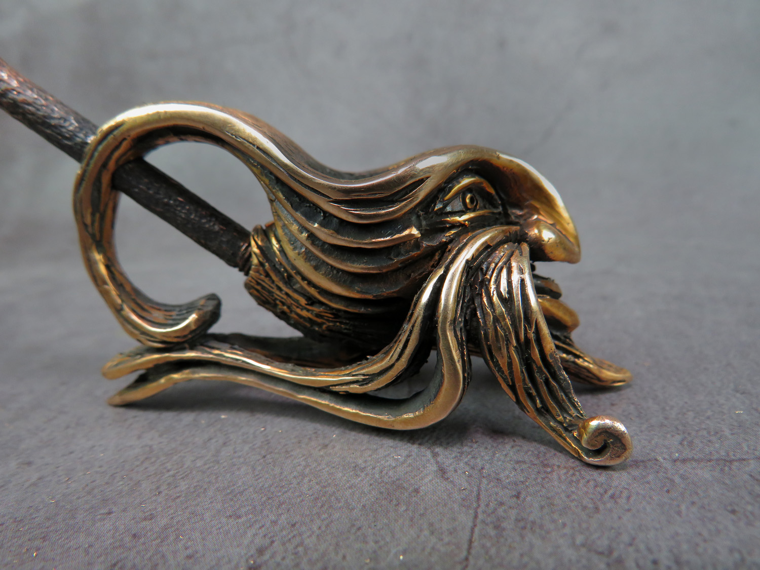 To make this item, a wax model was cut out by hand. Then, using the lost wax method, bronze parts were cast.