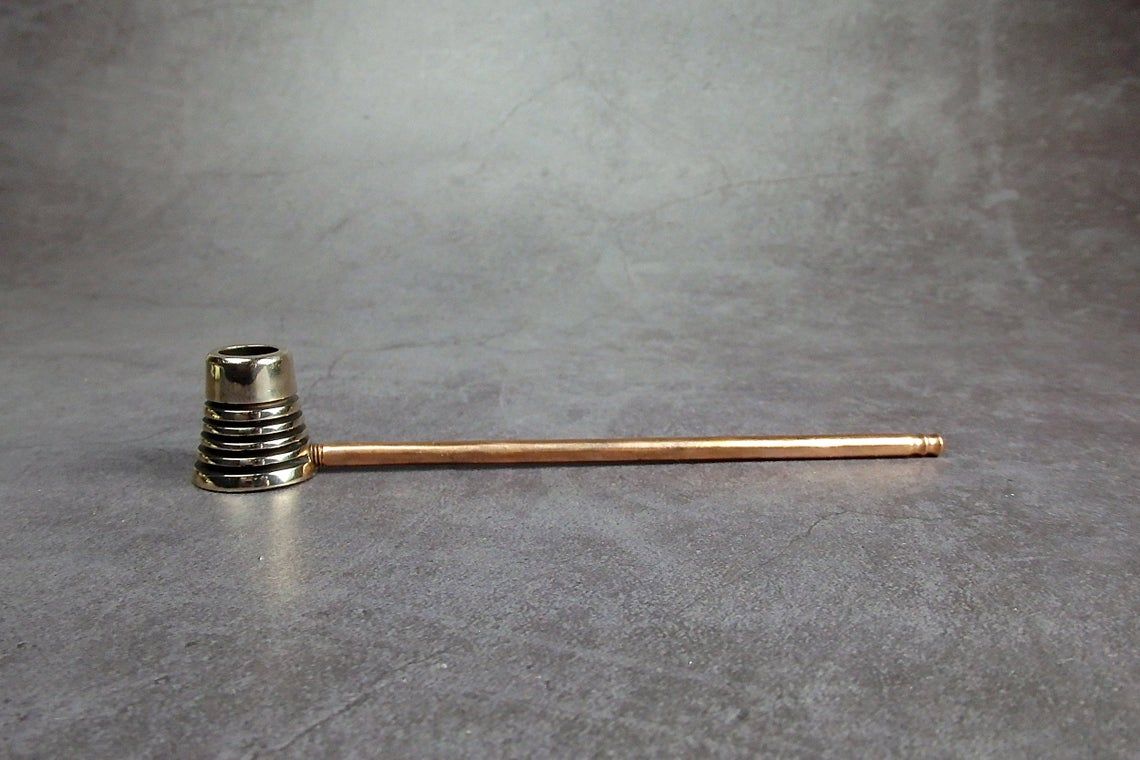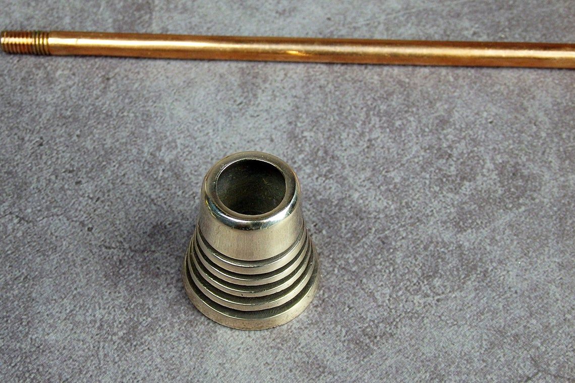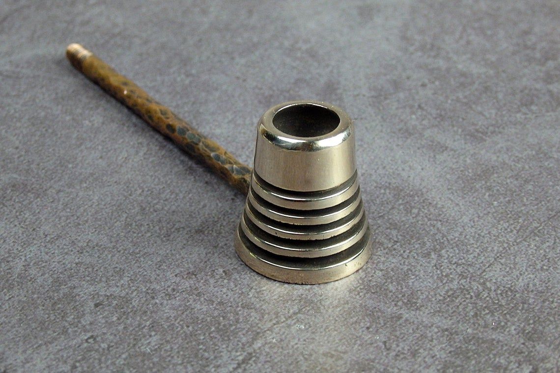 Bowl of pipe made of polished bronze, mouthpiece made of copper, it is screwed on, can have a length (from 3 to 30 cm) and a shape at the request of the buyer. The pipe is working, not decorative, the model is tested by the master.