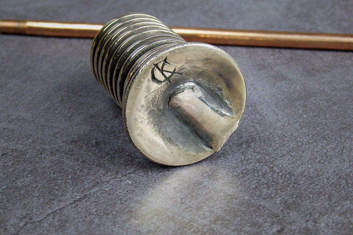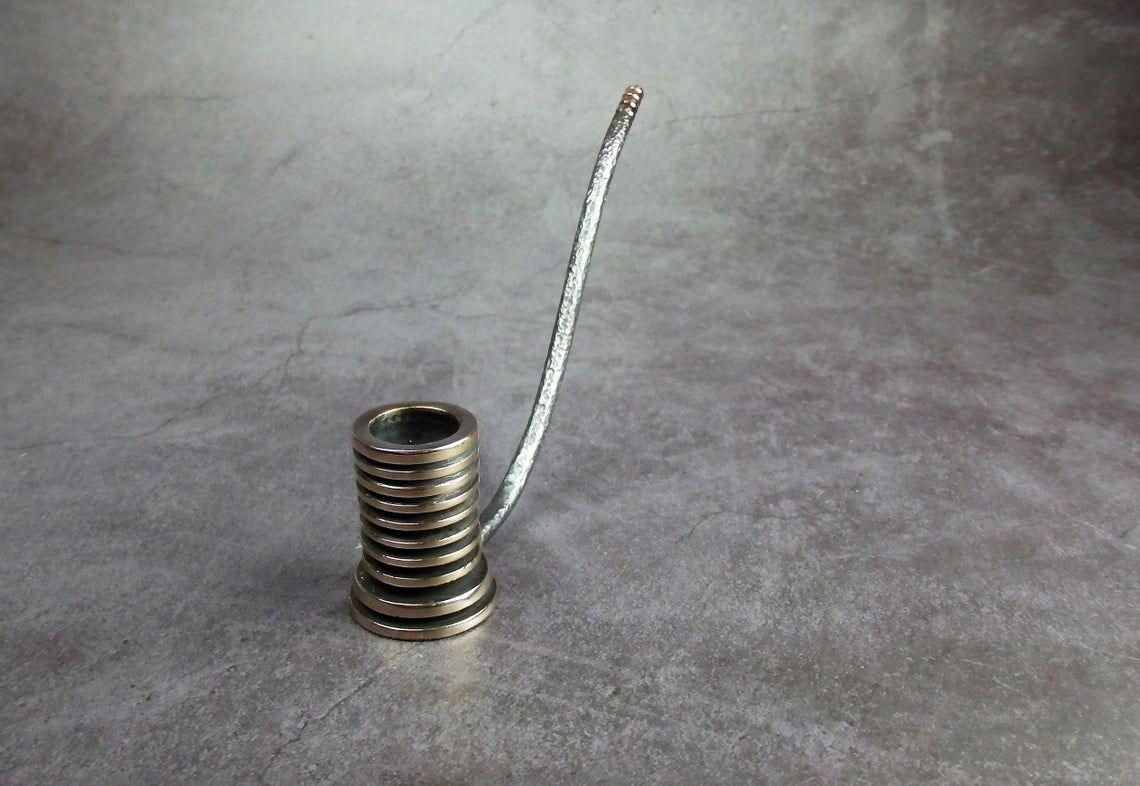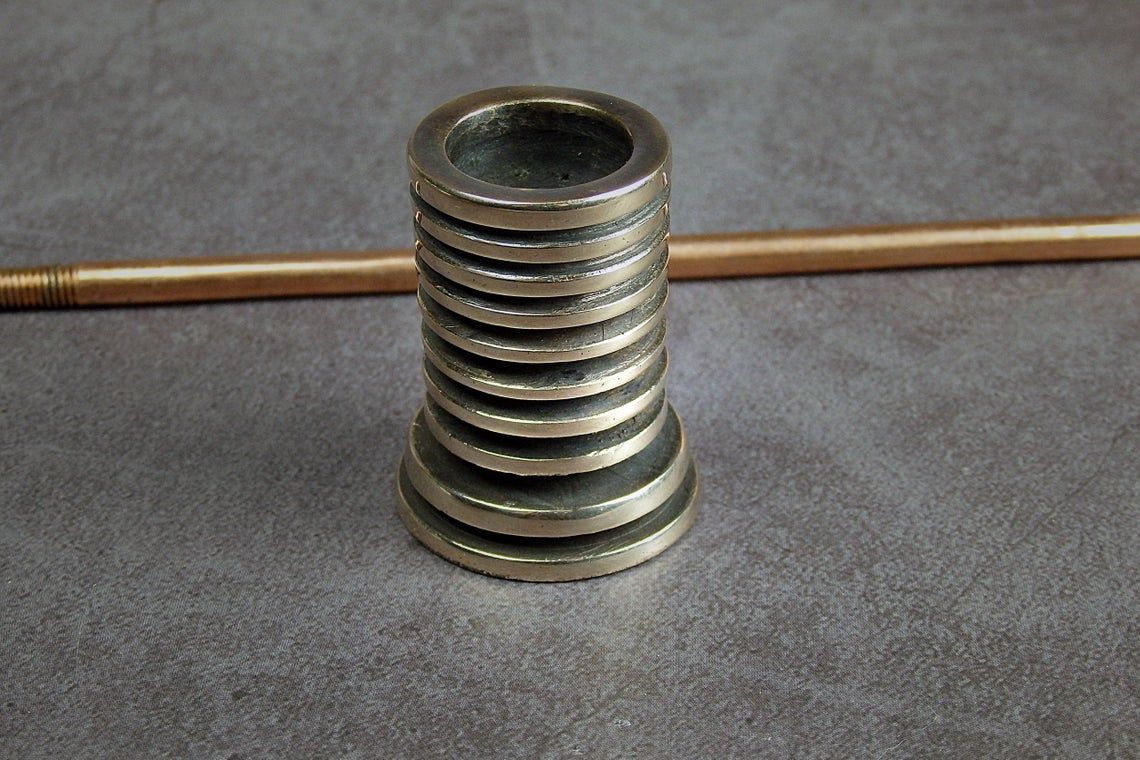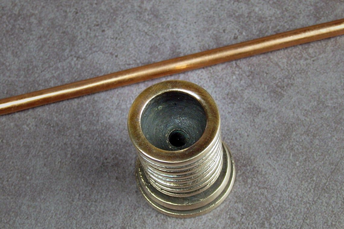 Bowl of pipe made of polished bronze, mouthpiece made of copper, it is screwed on, can have a length (from 3 to 30 cm) and a shape at the request of the buyer. The pipe is working, not decorative, the model is tested by the master.