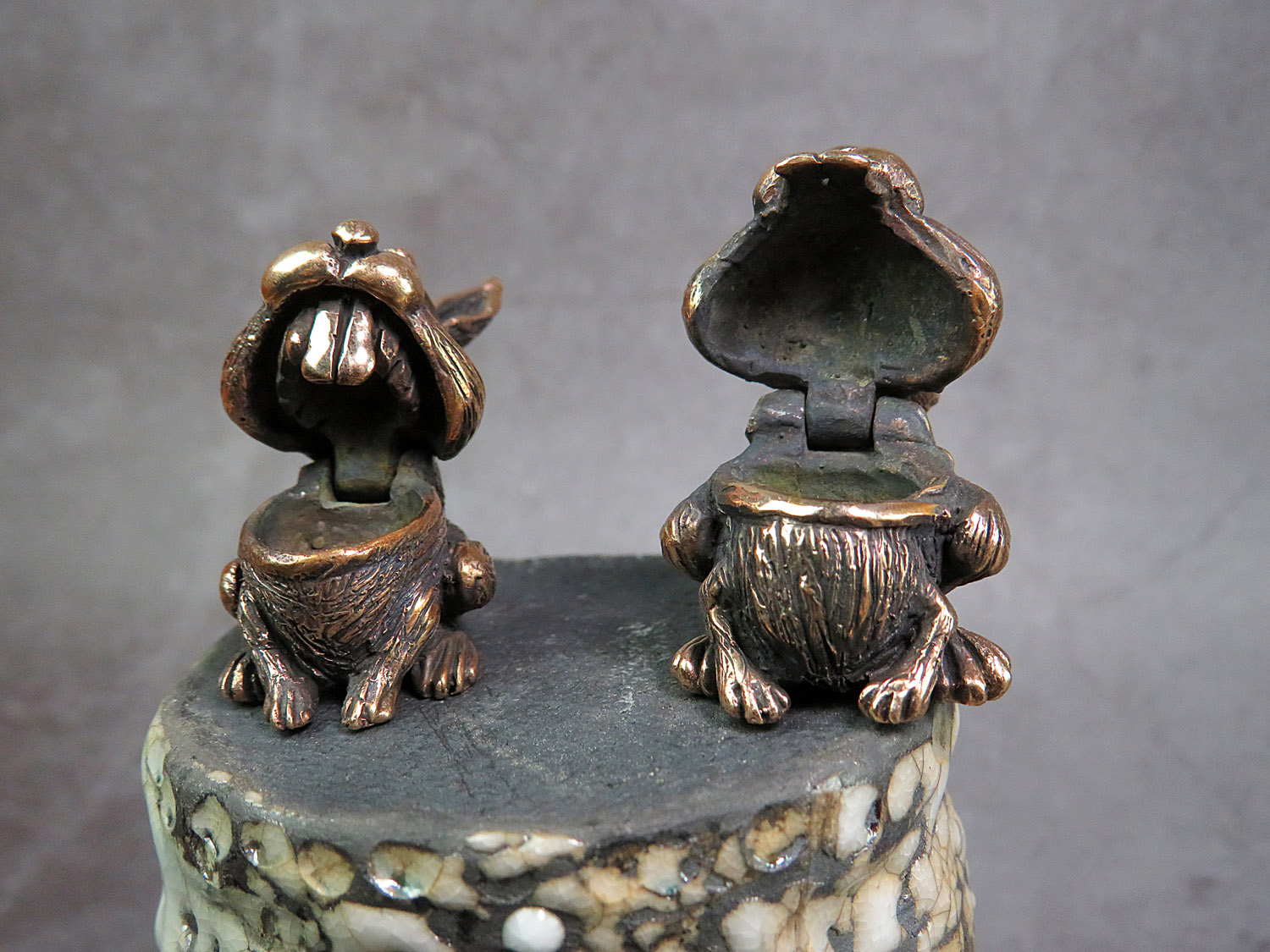 Funny little bronze rabbits, symbols of this year according to the Chinese lunar calendar. These figurines can be used as tabletop souvenirs, tiny candlesticks, miniature boxes, or fun feng shui miniatures that bring good luck.