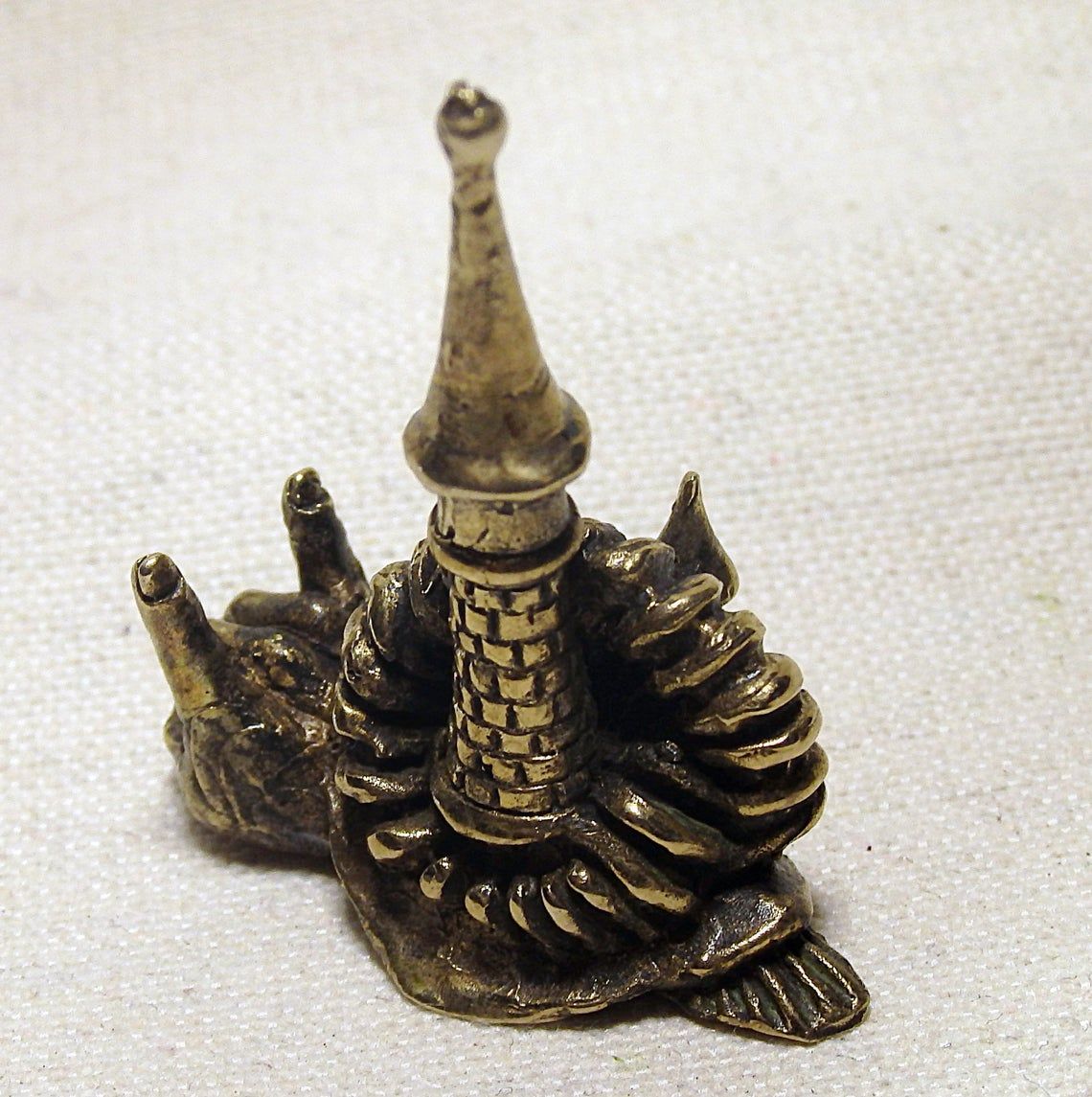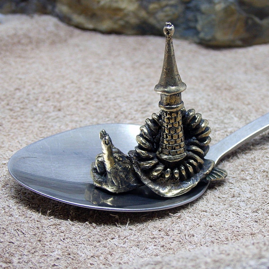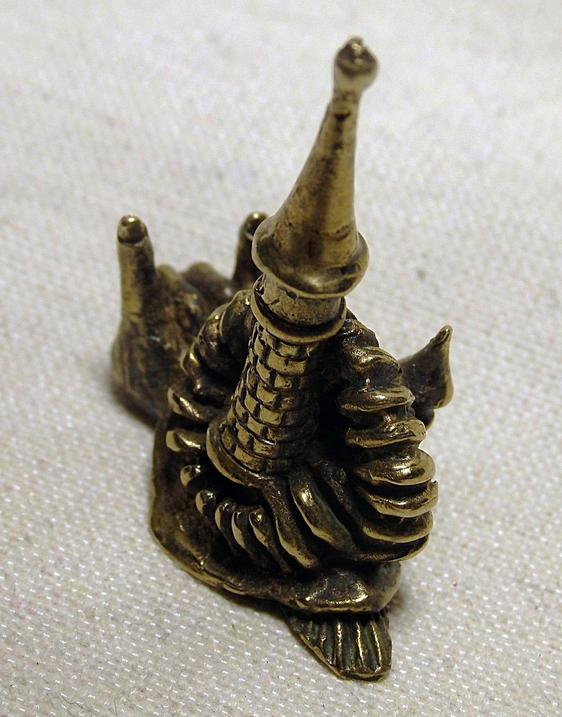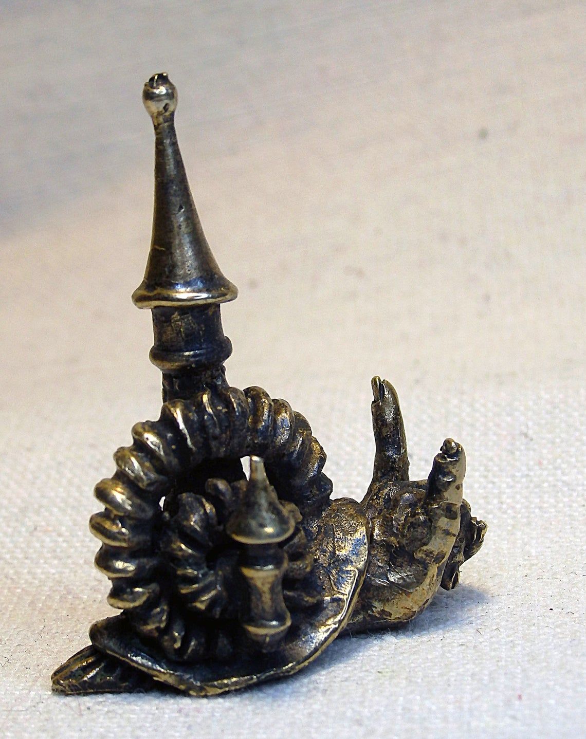 A miniature figurine of bronze. Another snail from the rock-family with horns in the form of a rock-gesture "Goat" and with graceful fairy turrets on the back.