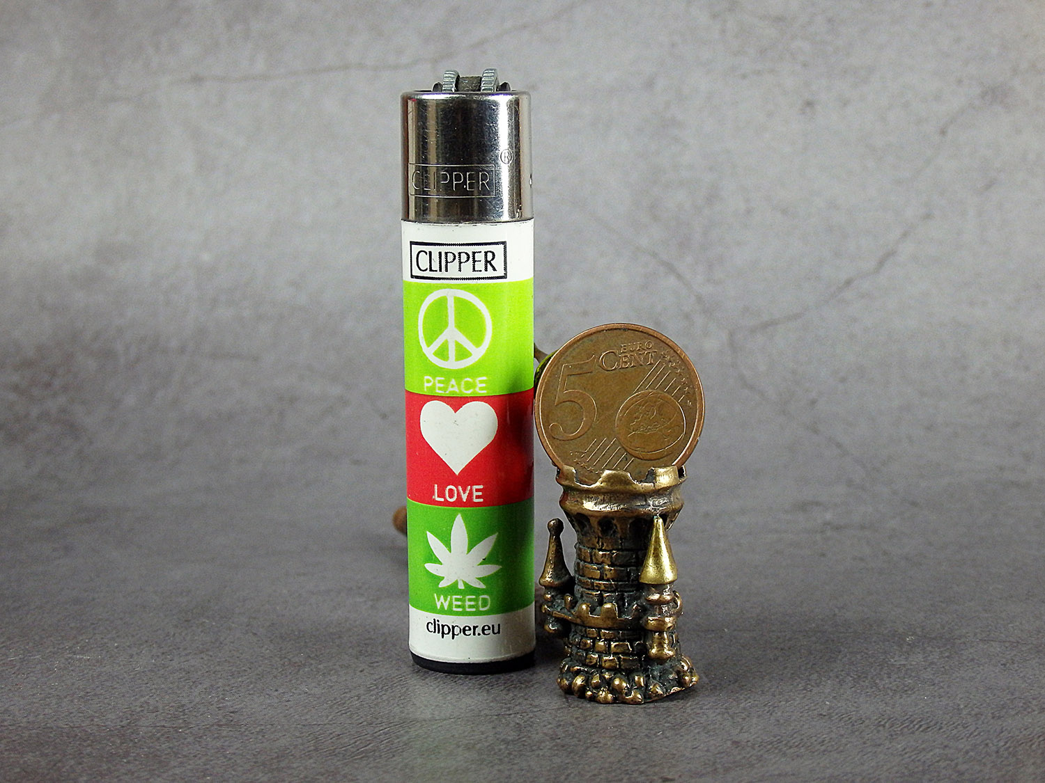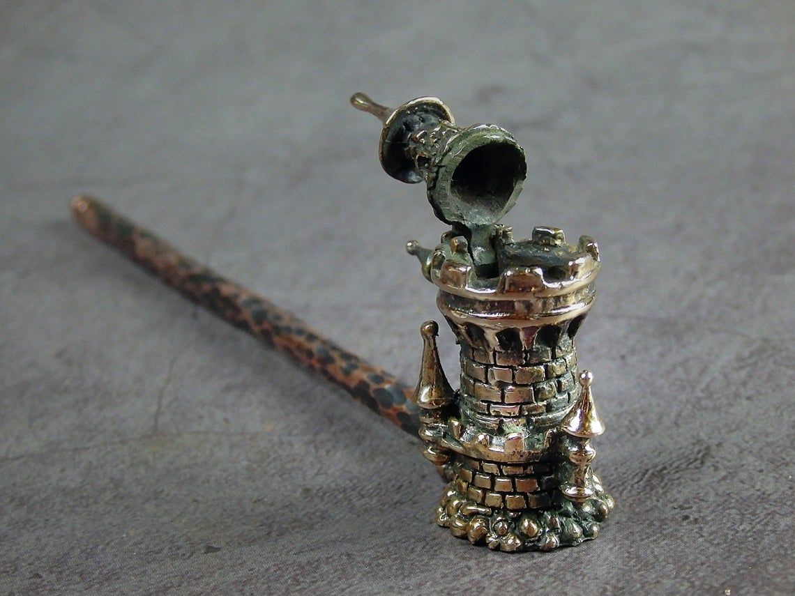 Handmade bronze smoking pipe in the shape of watchtower with roof - lid.