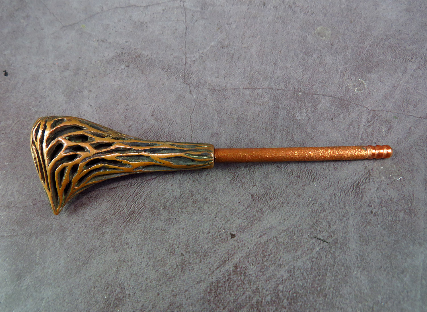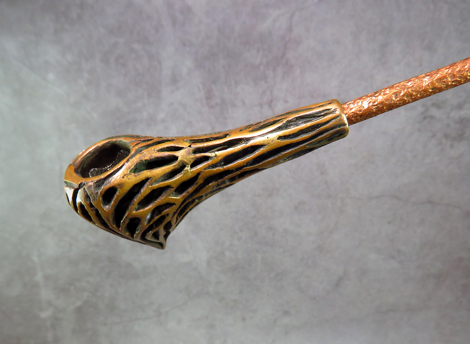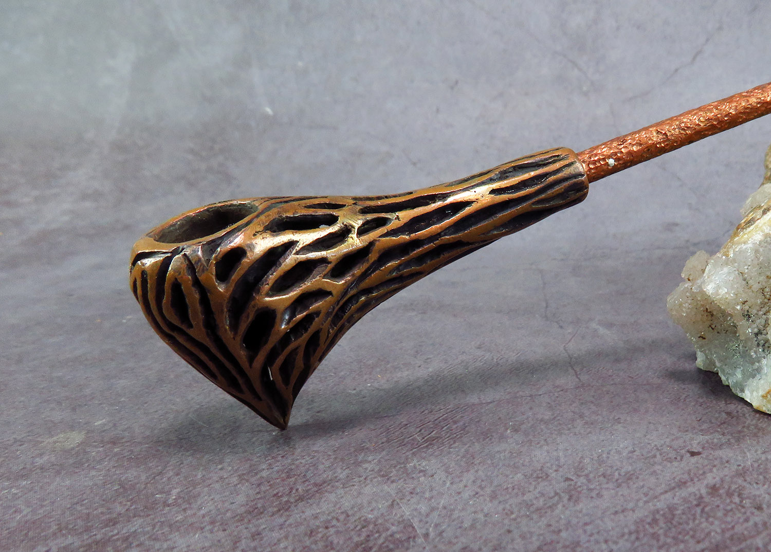 Bronze smoking pipe of an unusual shape with an openwork wooden texture. The mouthpiece is made of copper, it is screwed on, can have a length (from 3 to 30 cm) and a shape at the request of the buyer. Note! When choosing a mouthpiece, keep in mind that this pipe can stand on a plane only with straight mouthpiece.
