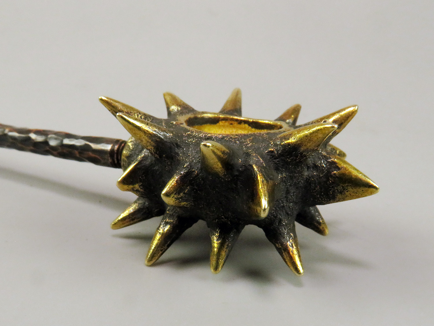 To make this item, a wax model was cut out by hand. Then, using the lost wax method, bronze parts were cast.