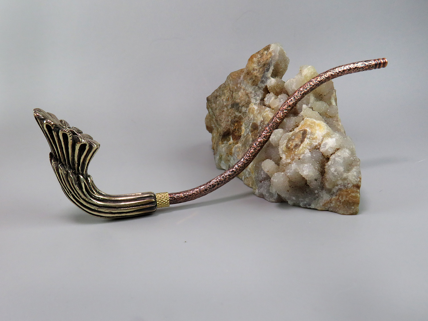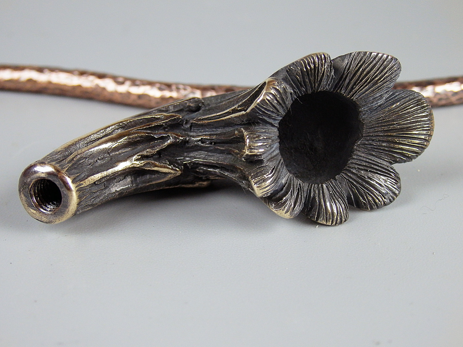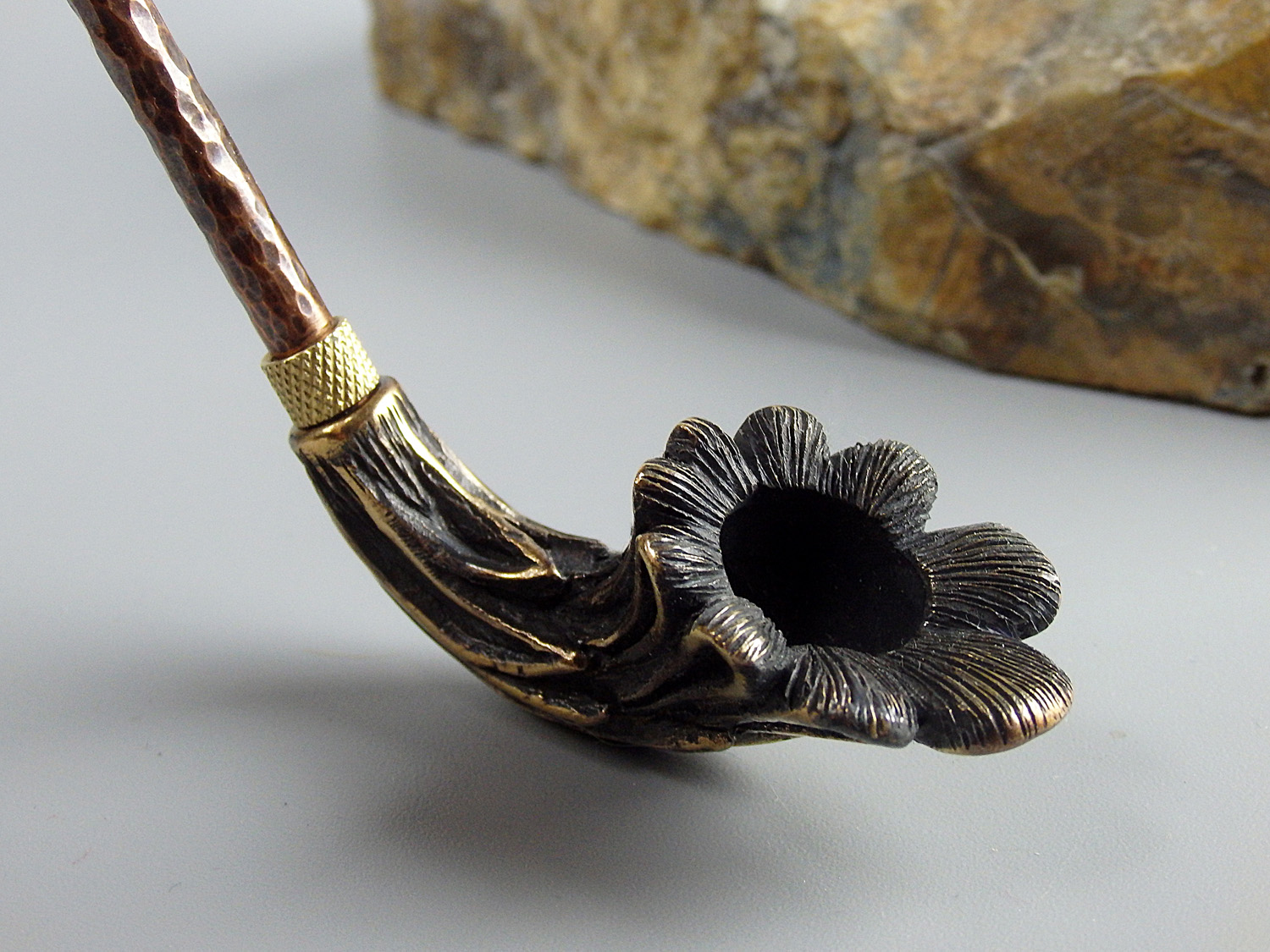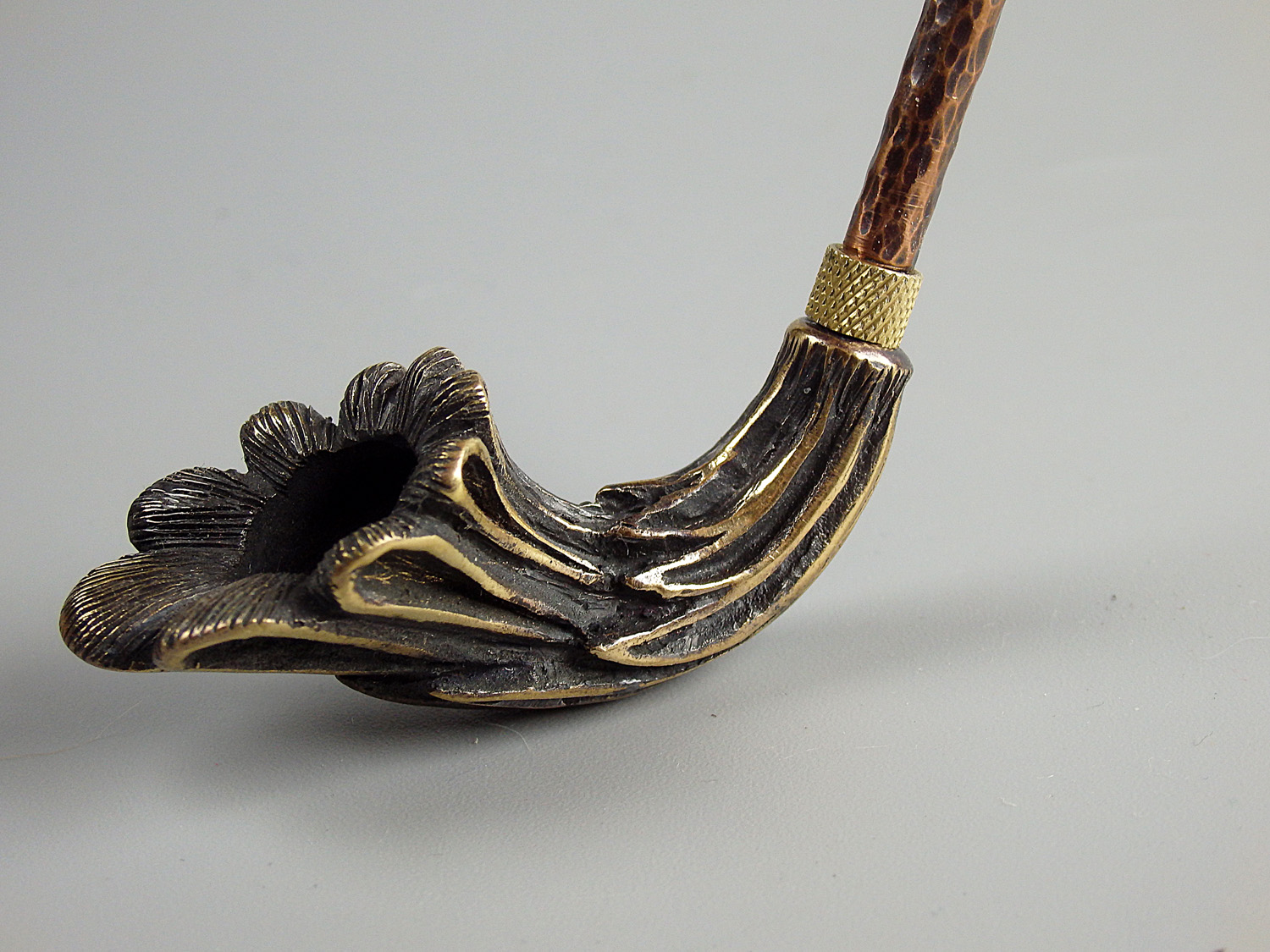 Designer bronze churchwarden pipe with a bowl resembling a exotic flower. The mouthpiece is made of copper, it is screwed on, can have a length (from 5 to 30 cm) and a shape at the request of the buyer. The pipe is working, not decorative, the model is tested by the master.